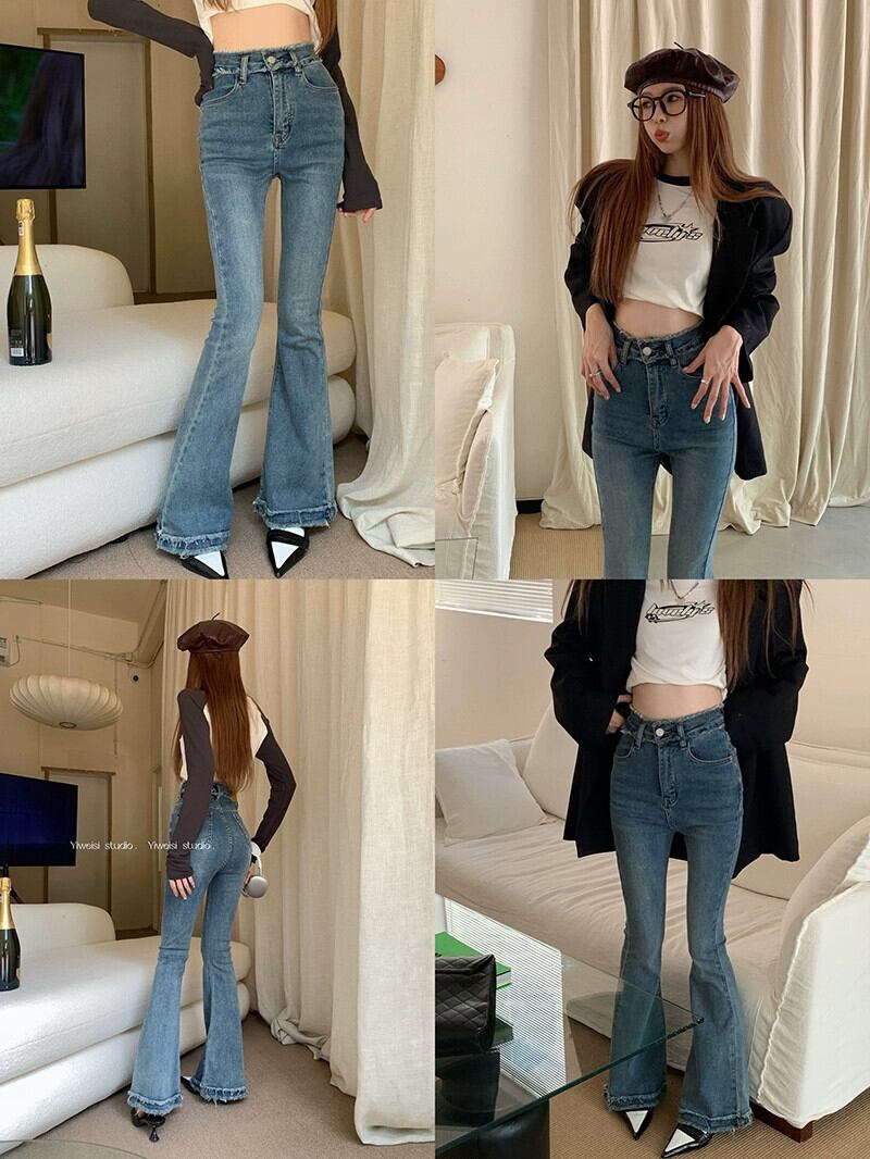 -秋のウエストゴムの生エッジのホースシュージーンズ、スリムフィットのストレートパンツ、小柄な人向け、わずかにフレアした床までの長さのズボン レッド エラスティック 伸縮 オータム 秋物 bstraw65185614355 | beaute25