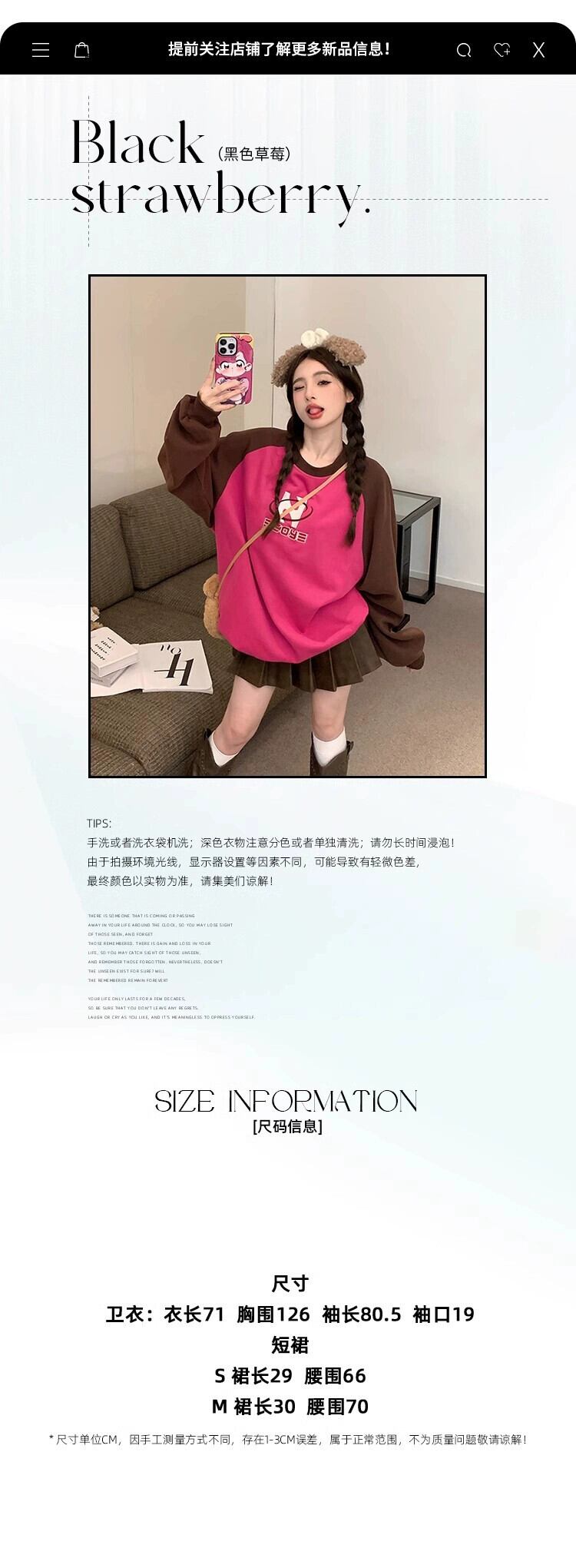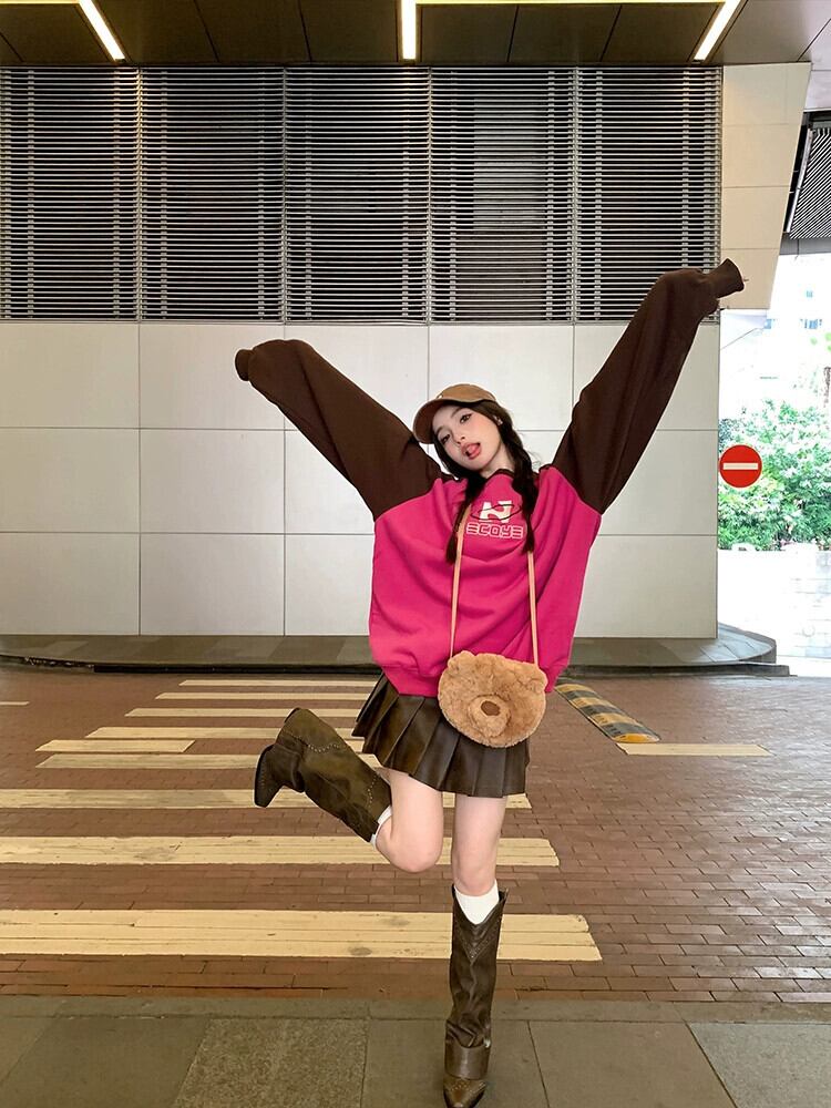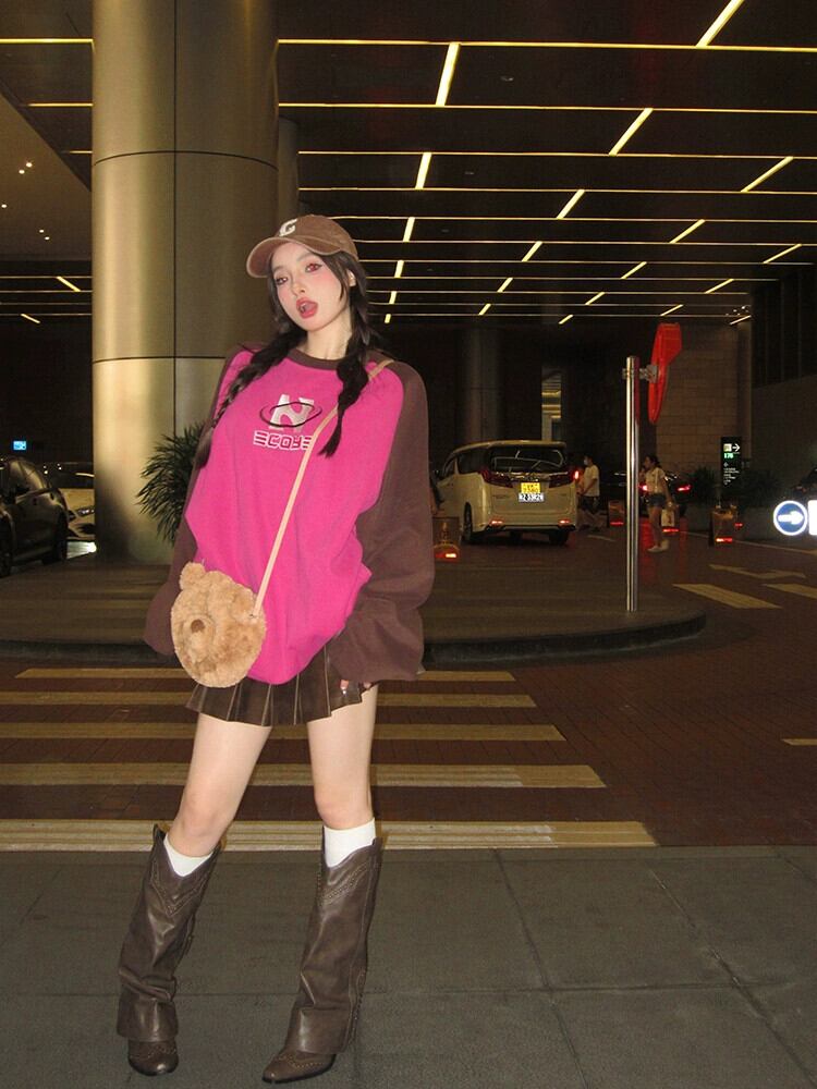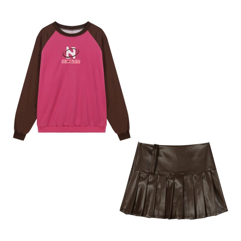 色:コーヒーカラーのパッチワークスウェットシャツ,短いスカート