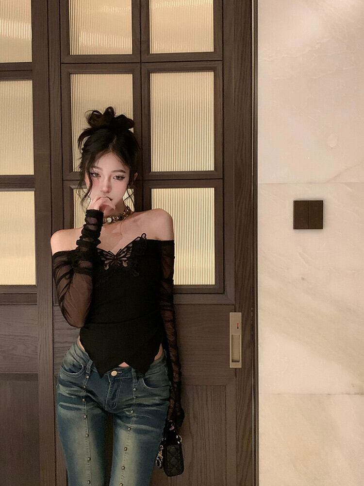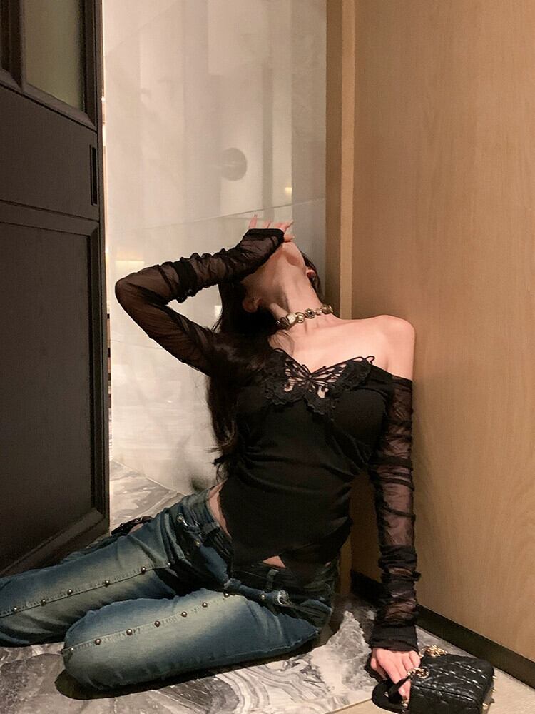 純粋な欲望スタイルの黒のワンショルダー長袖 T シャツの女性と秋のデザインの蝶スリム ショート メッシュ スプライシング トップ ロング ブラック オータム 秋物 Tシャツ bstraw80378660518 | beaute25