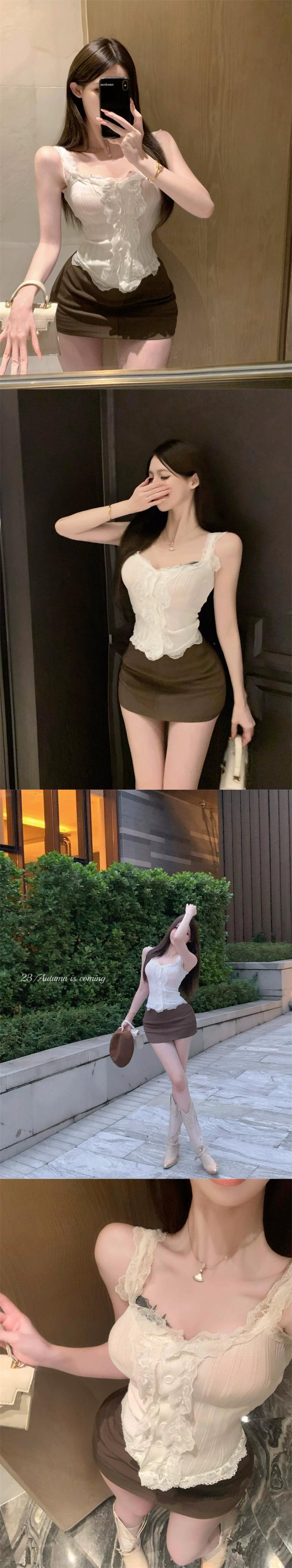 ブラックホットガールニットキャミソール女性の秋純粋な欲望スタイルセクシーなレーススプライシングスリムショートインナートップ オータム 秋物 ピュア bstraw21002972256 | beaute25
