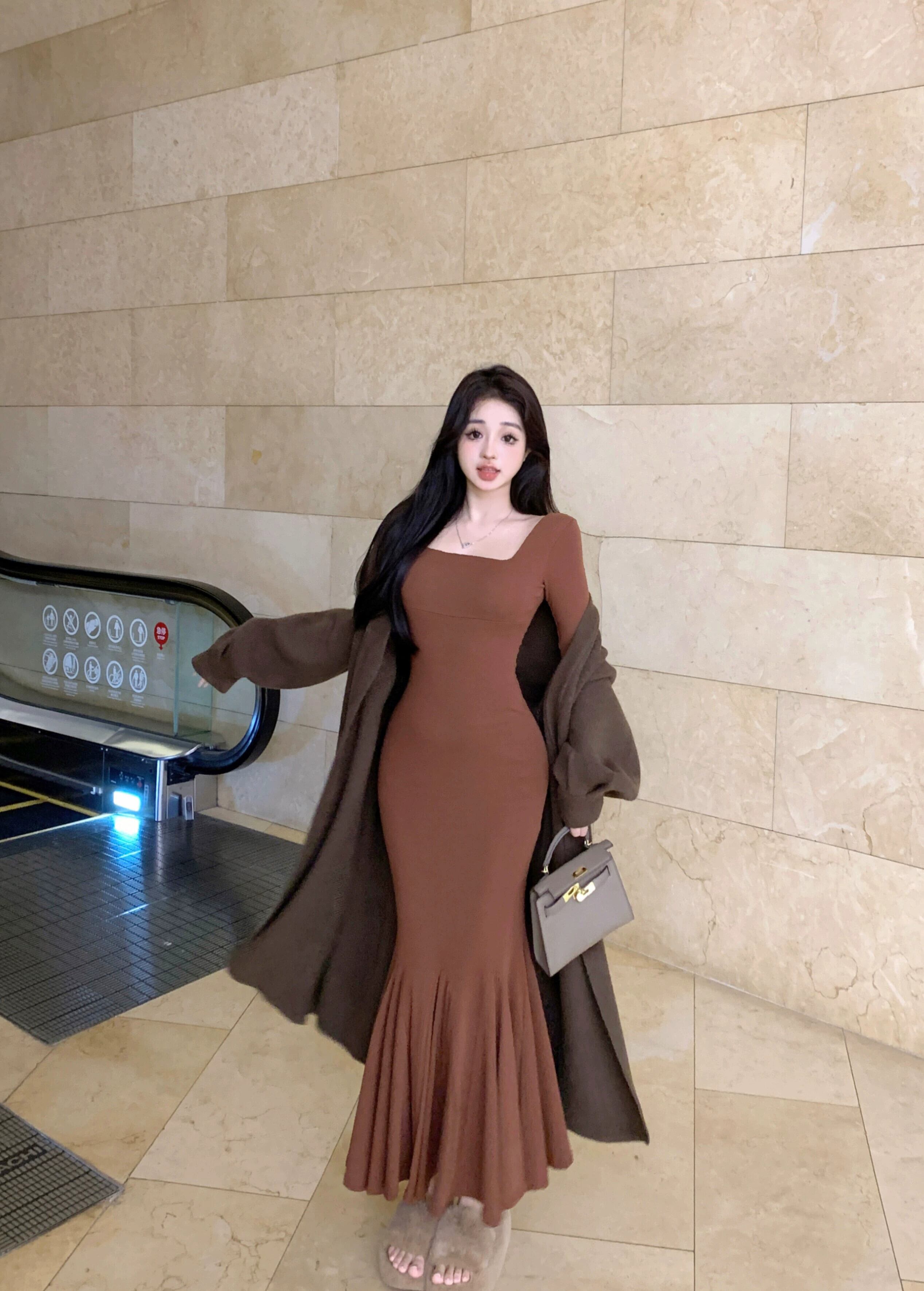 セクシーなヒップハグフィッシュテールロングスカートスクエアネックドレスレディース秋スーツミドル丈カーディガンジャケットトップ2点セット オータム 秋物 スクウェア bstraw58747725819 | beaute25