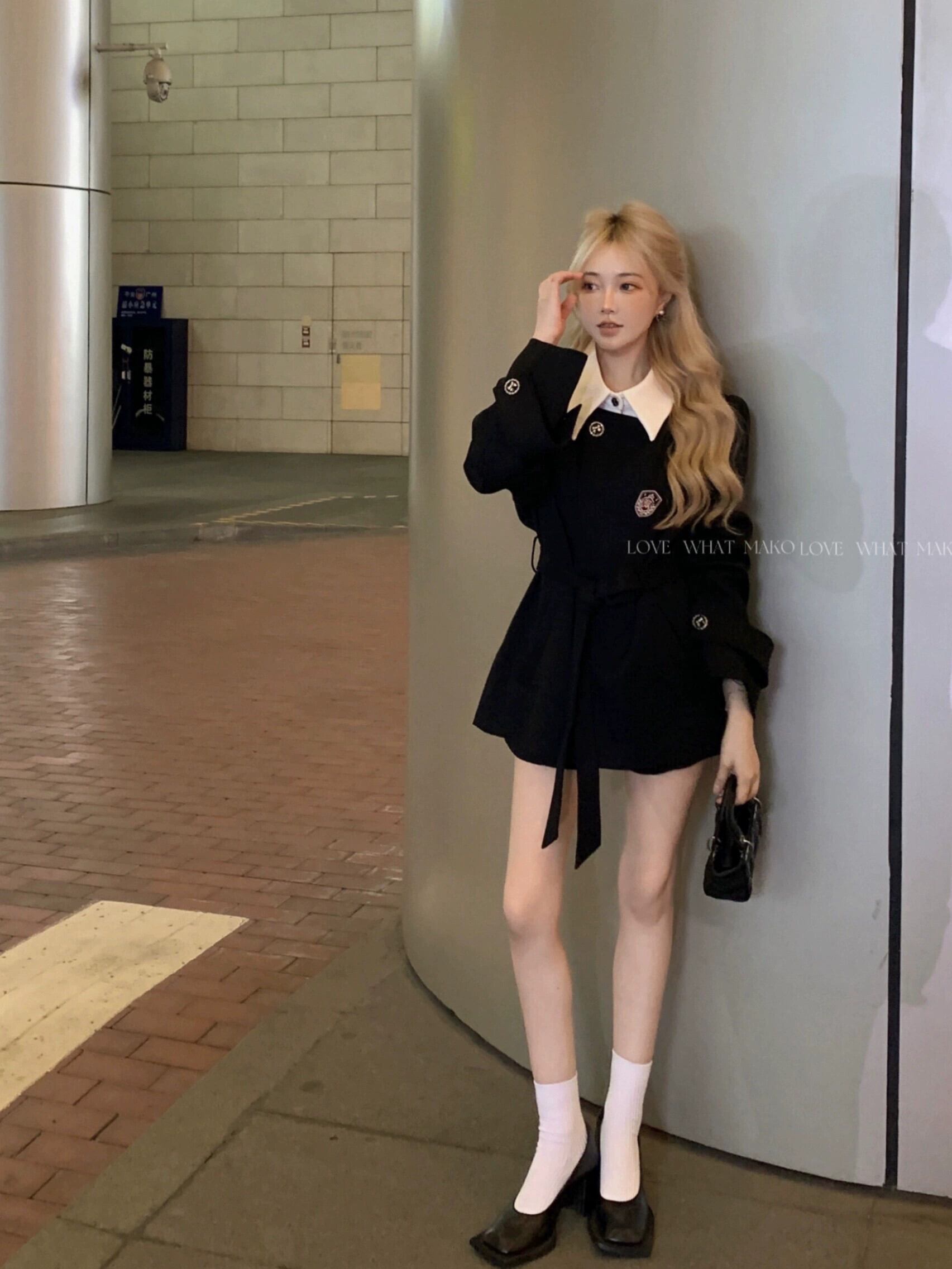 英国のカレッジスタイルの偽ツーピーススーツジャケットの女性、秋、ハイエンド、気質、ウエストを締める黒のスプライシングスーツトップ ブラック オータム 秋物 bstraw44935665902 | beaute25