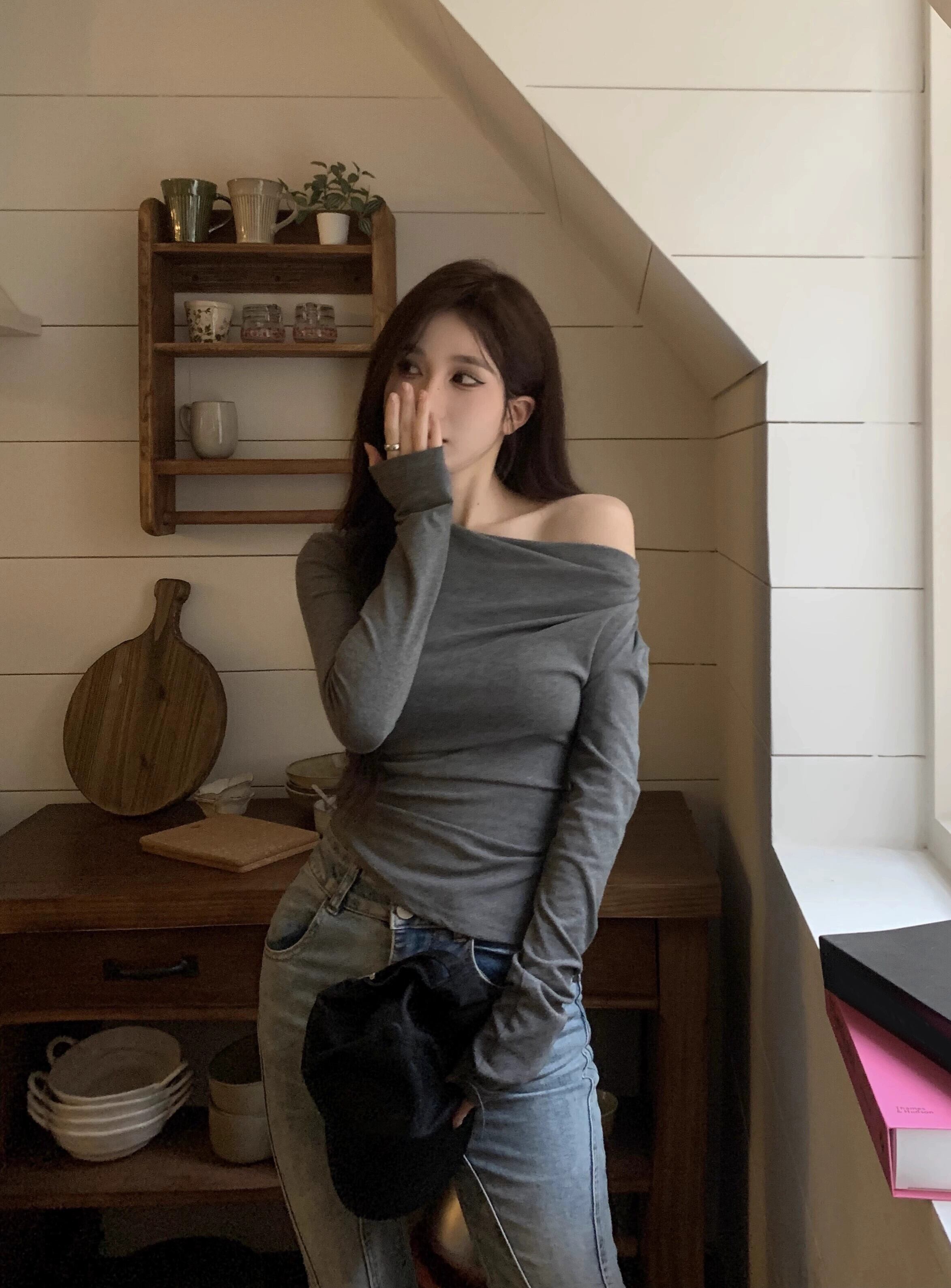 グレー ワンショルダー オフショルダー 長袖 Tシャツ レディース 2023 初秋新作 スリムフィット ショート インナー レイヤード シャツ トップス ロング レッド オータム 秋物 bstraw97813813110 | beaute25