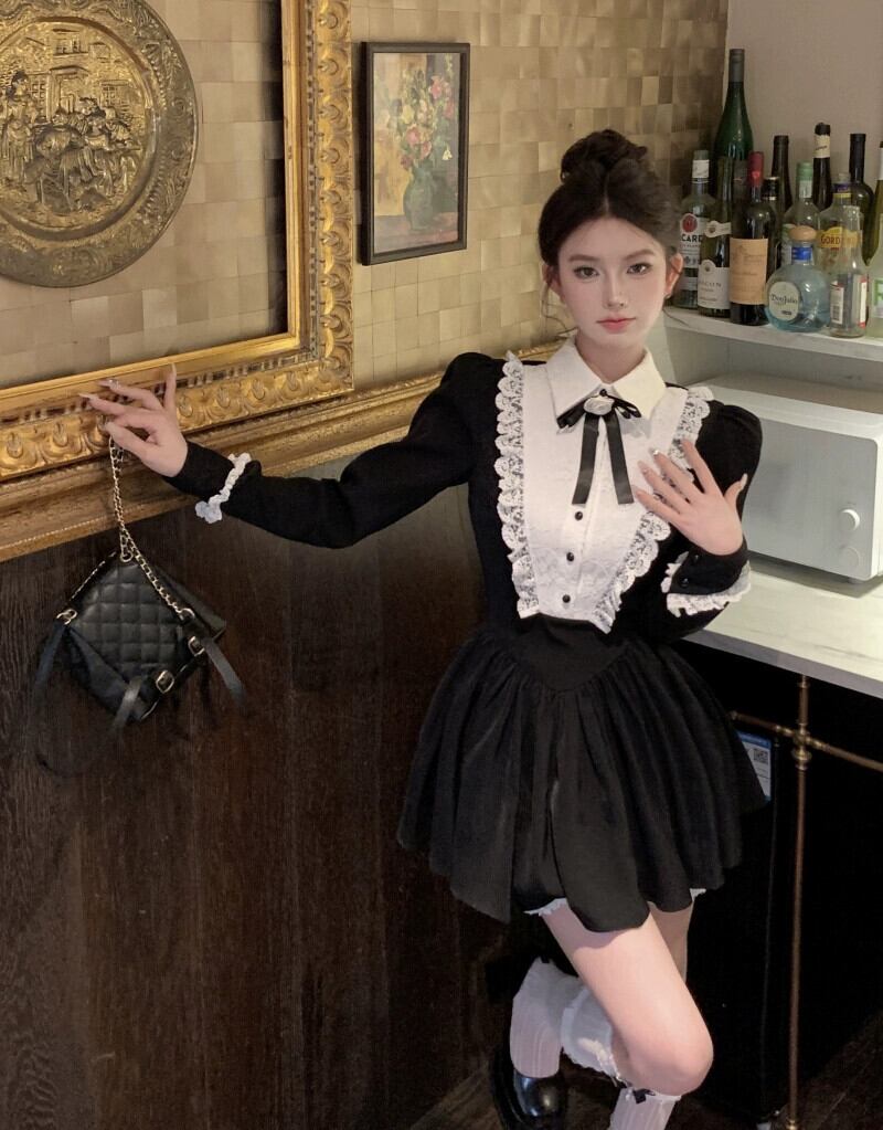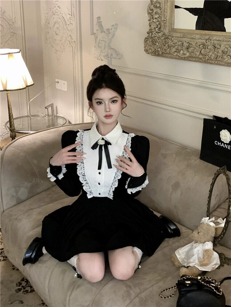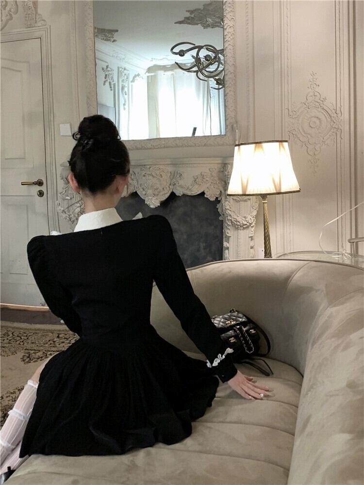 フランスのレトロな長袖ドレスの女性、秋のレースステッチ、黒のスカート、ウエストを締める気質、ふわふわのプリンセススカート ロング ブラック オータム 秋物 bstraw36662563012 | beaute25