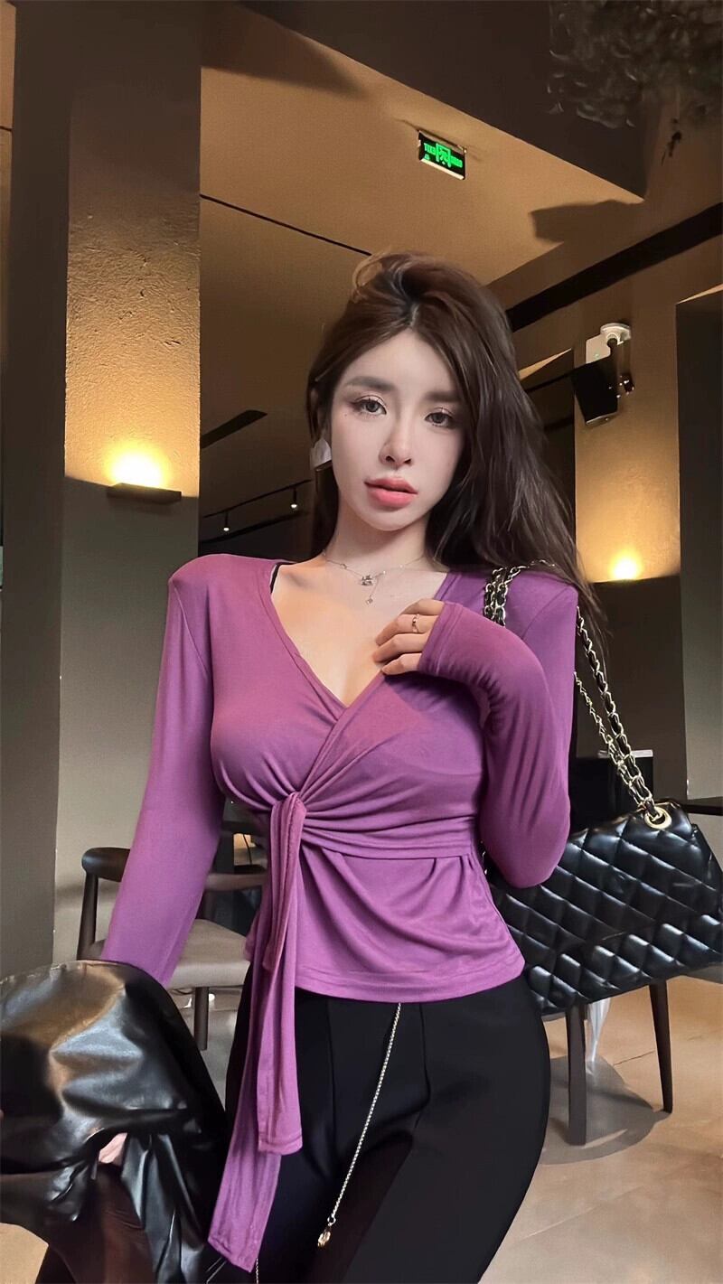 パープルセクシーな V ネック長袖 Tシャツ女性の秋スリムウエストストラップショートボトシャツショルダーパッドトップ ロング オータム 秋物 Vネック bstraw59872705129 | beaute25