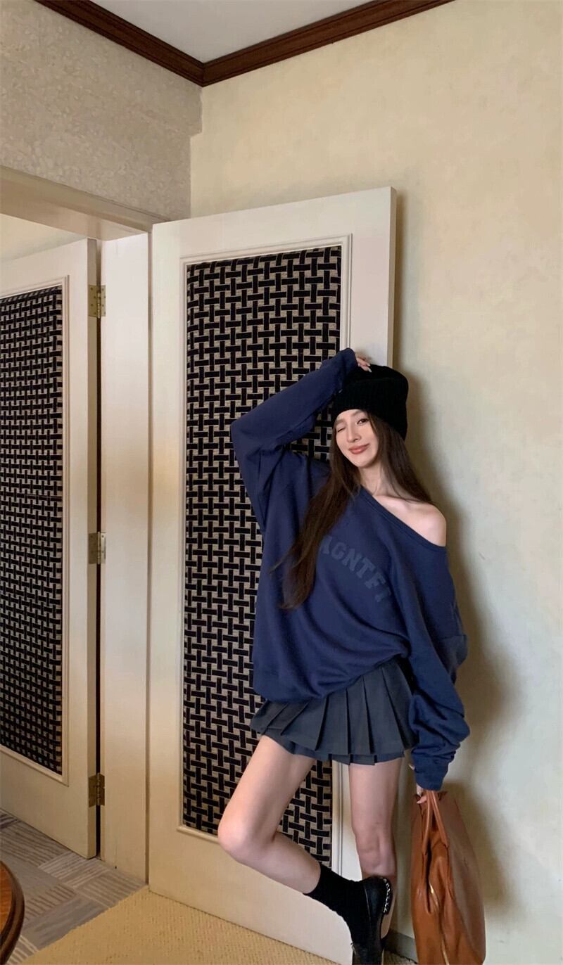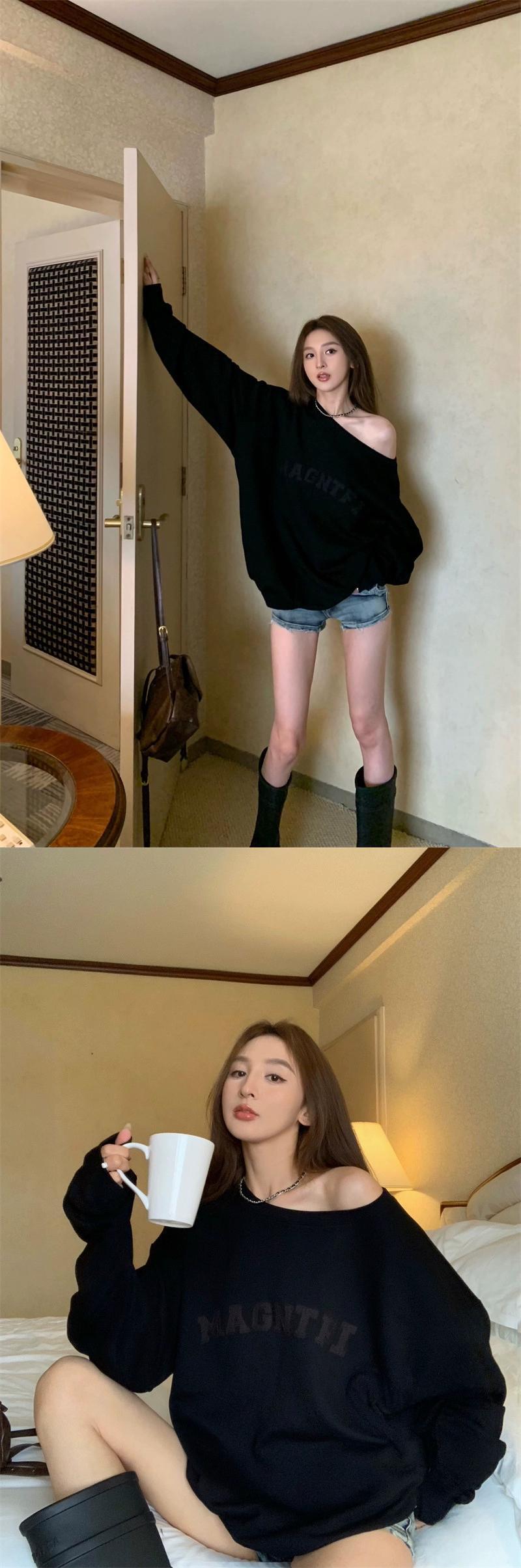 アメリカの文字刺繍パッチブルー長袖トレーナー秋の怠惰なスタイルのラウンドネックプルオーバールーズオフショルダートップ ロング レッド オータム 秋物 Oネック bstraw92902986539 | beaute25