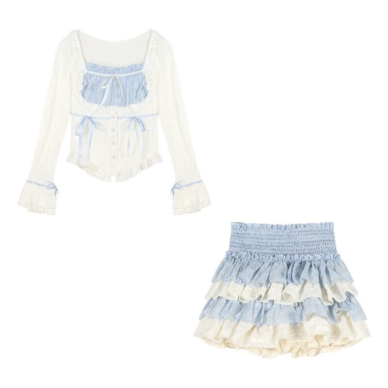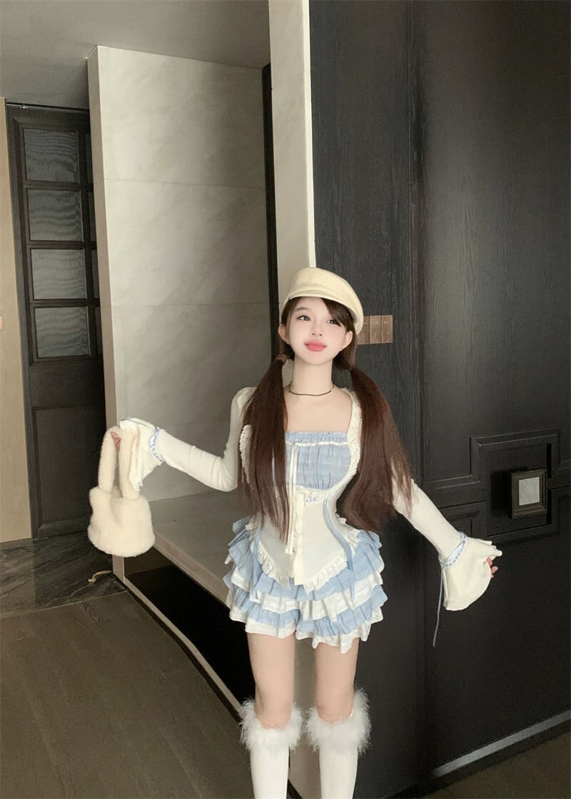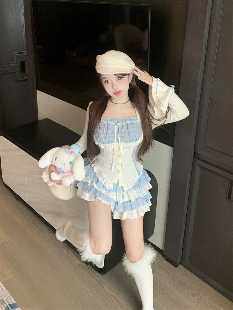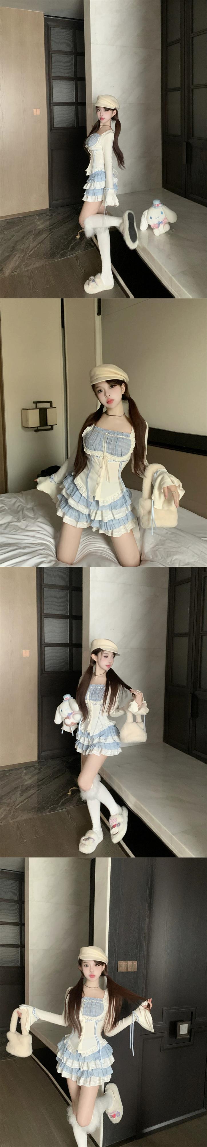 ホットバレエスタイルスーツ対照的なカラースプライシング長袖ウエストトップ女性秋ケーキスカートショートスカートツーピースセット ロング オータム 秋物 bstraw28596217730 | beaute25