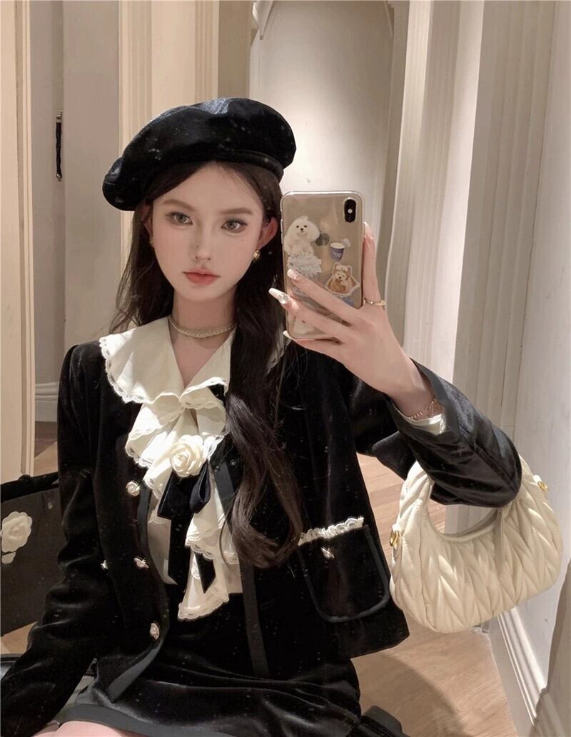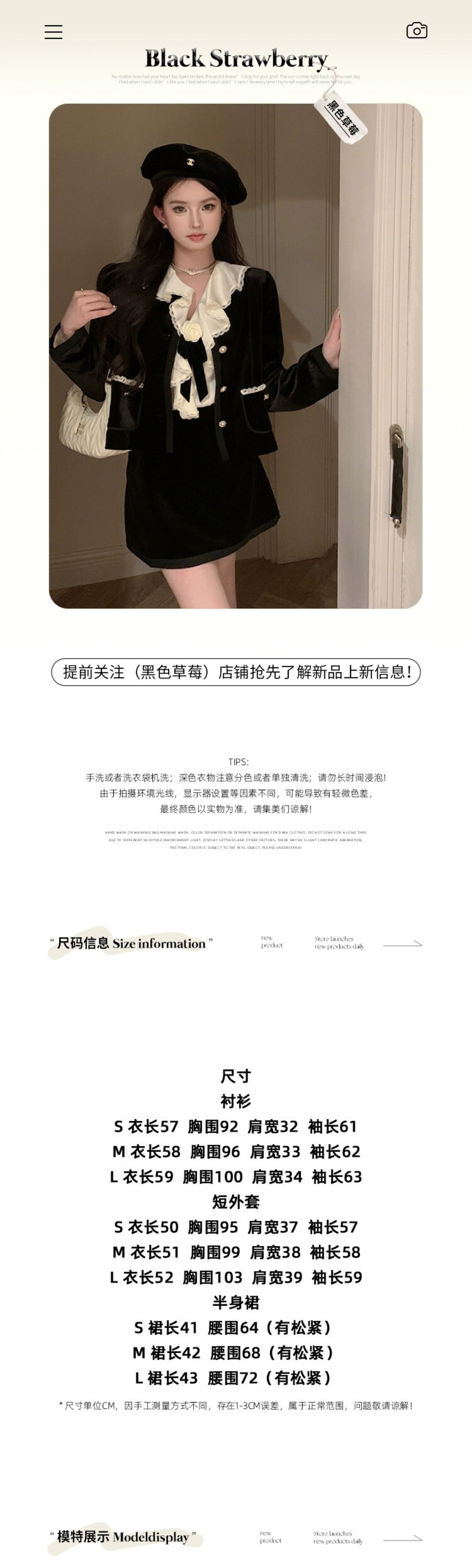 Xiaoxiang スタイル黒ベルベットショートコートスーツフリルシャツ女性の秋のスカートショートスカート 3 点セット ブラック オータム 秋物 bstraw1555034022 | beaute25