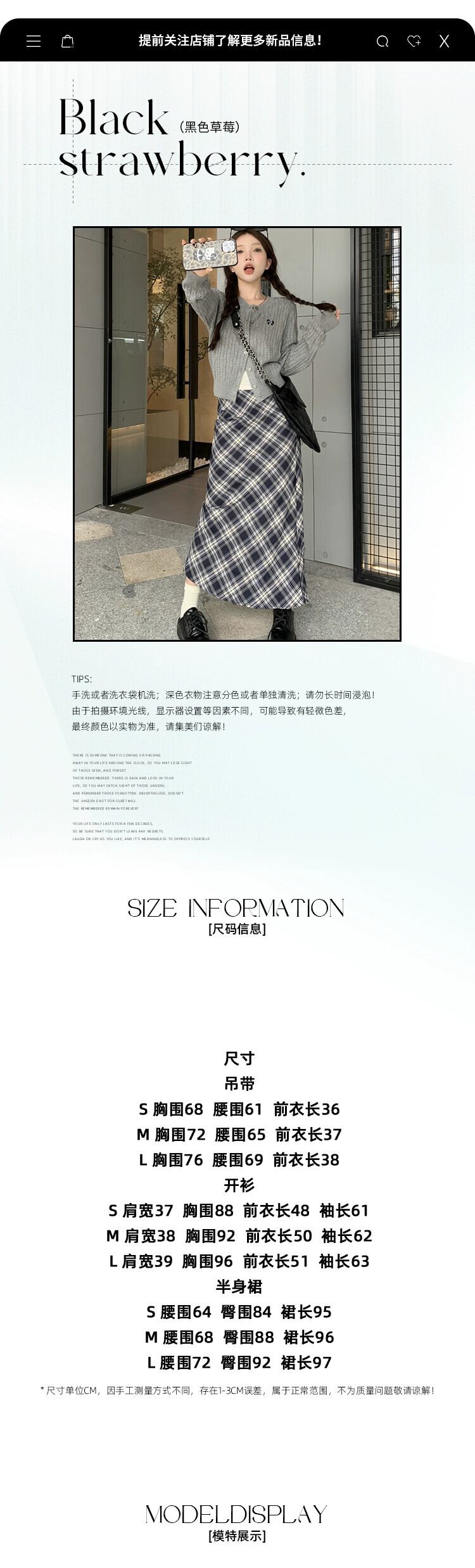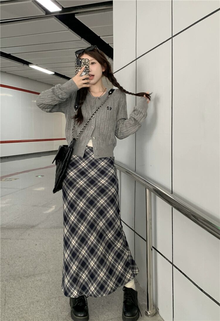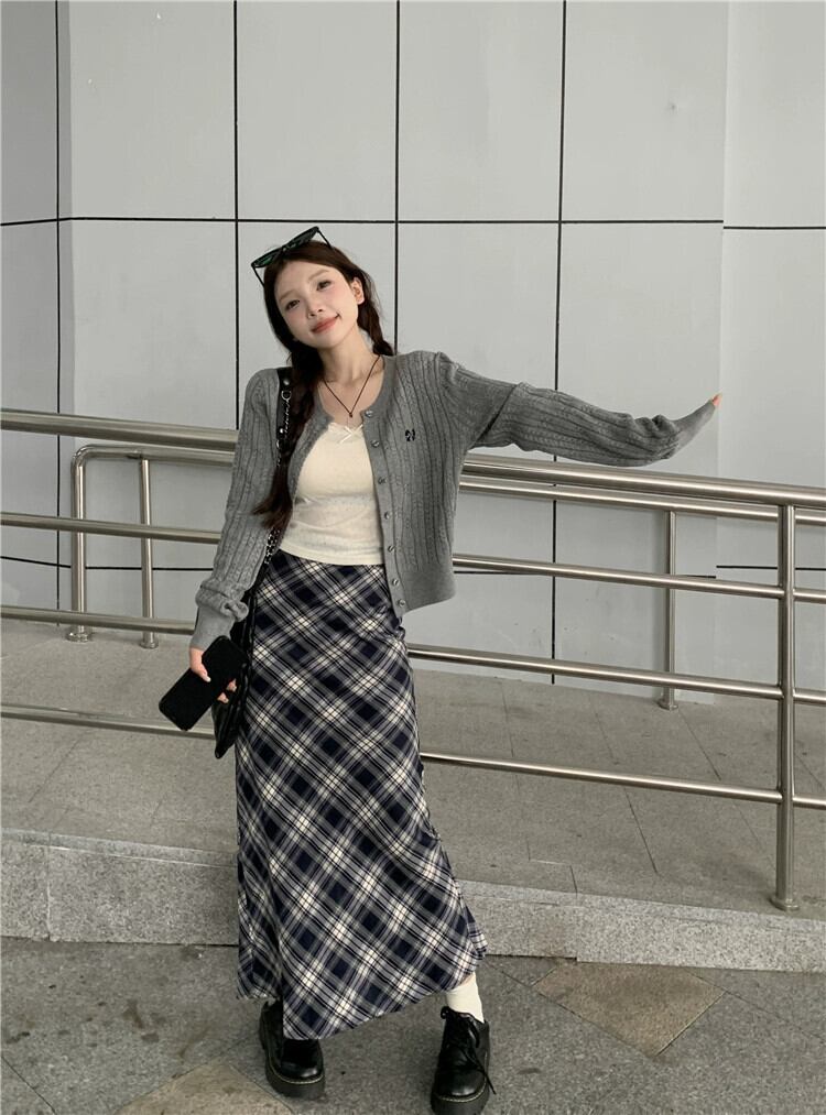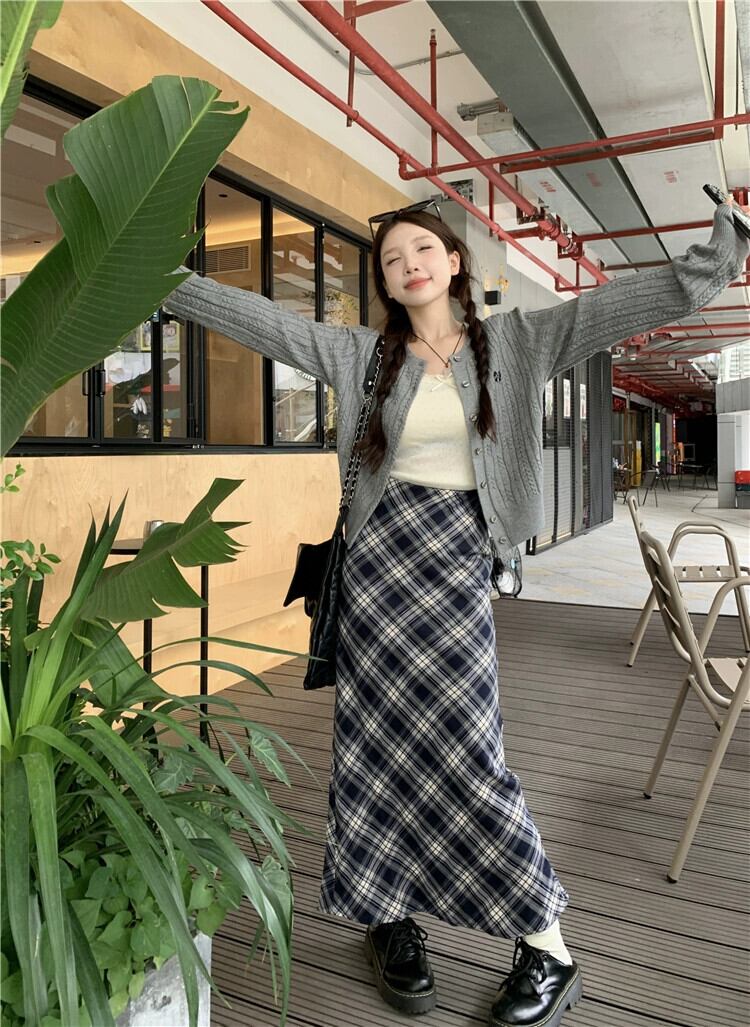 色:白いベスト,グレーのカーディガン,青い格子縞のスカート