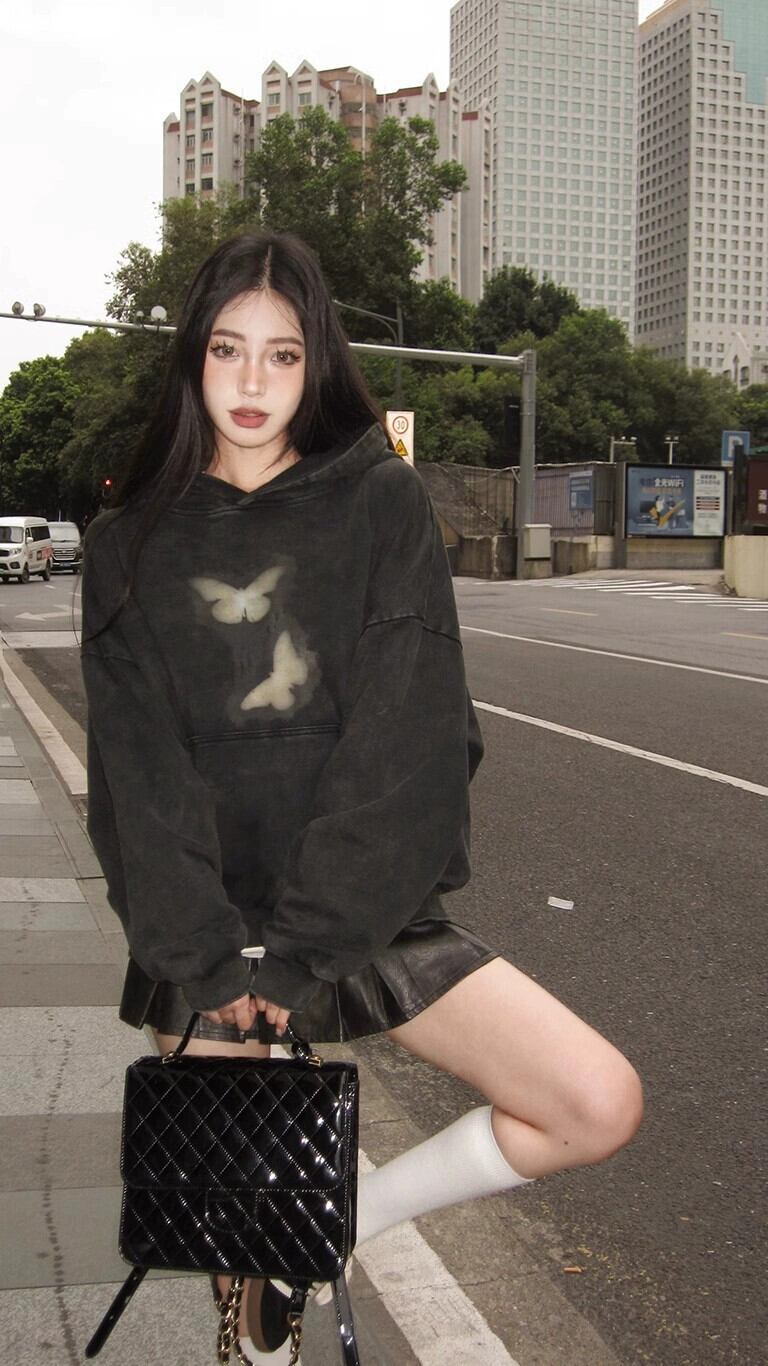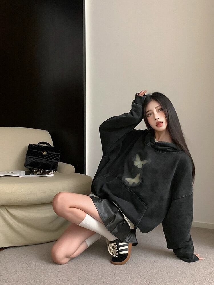 アメリカン レトロ ウォッシュ ディストレスト スウェットシャツ レディース 秋 ニッチ バタフライ プリント ルーズ ブラック トップ オータム 秋物 bstraw15071577188 | beaute25