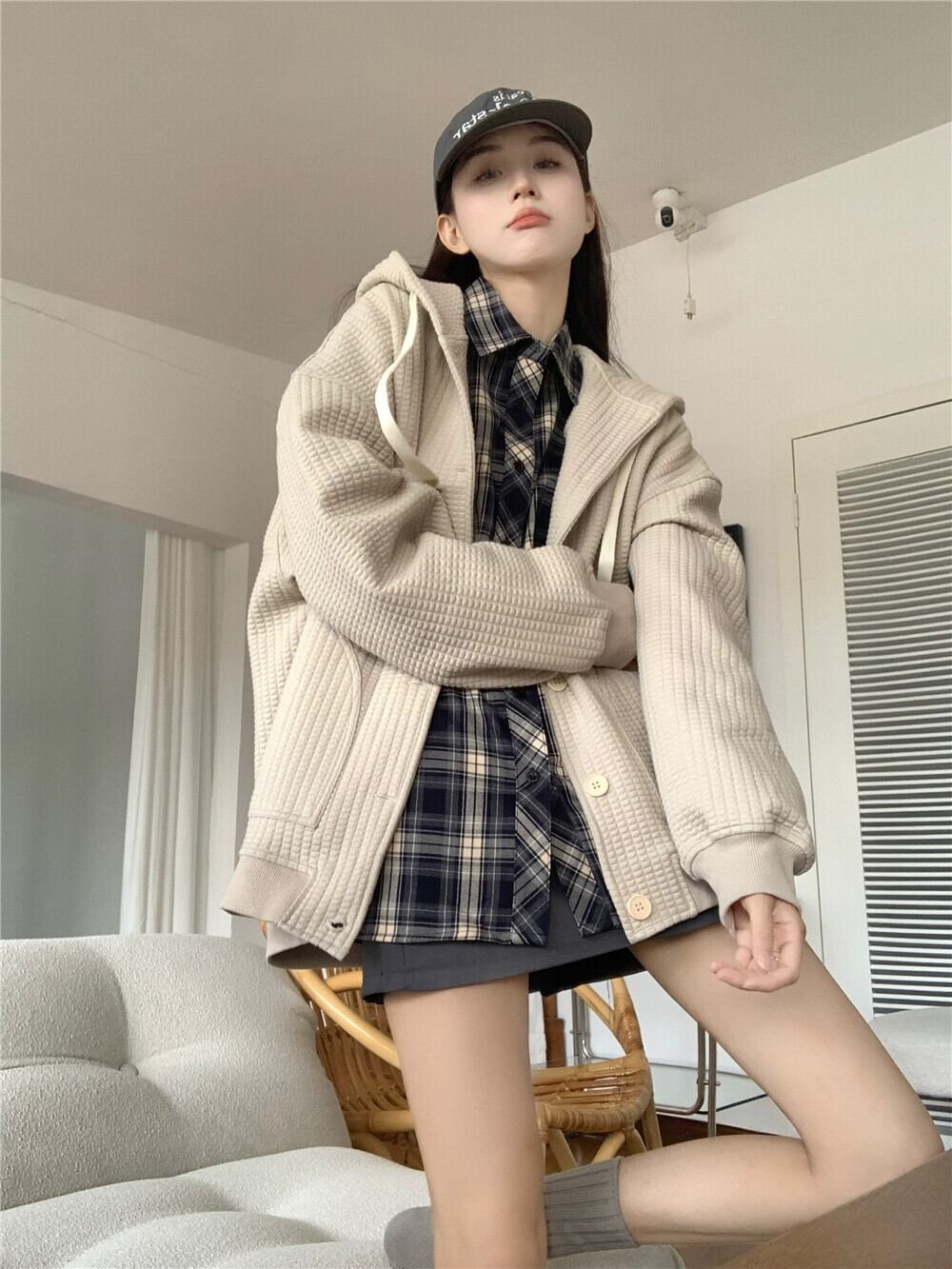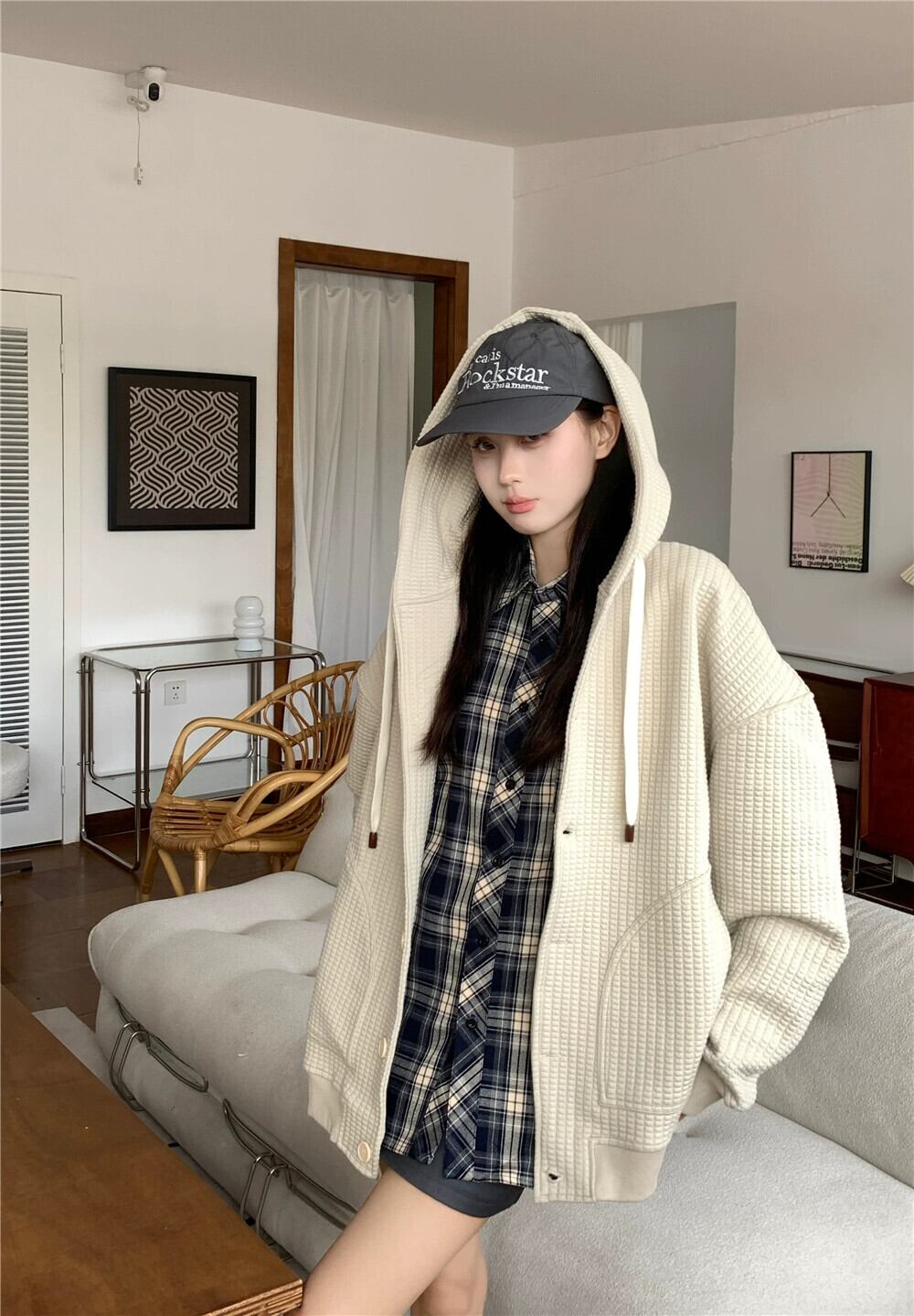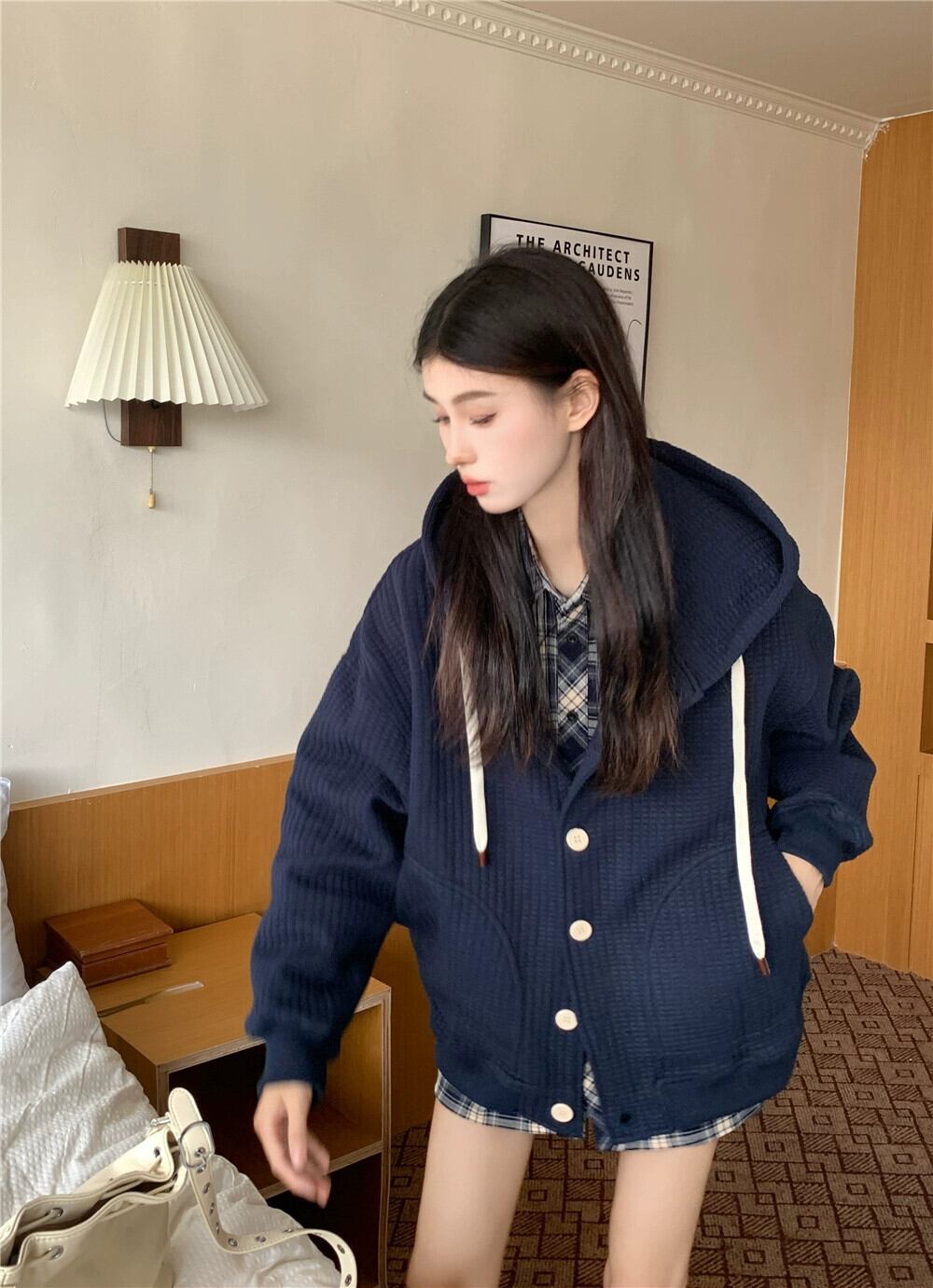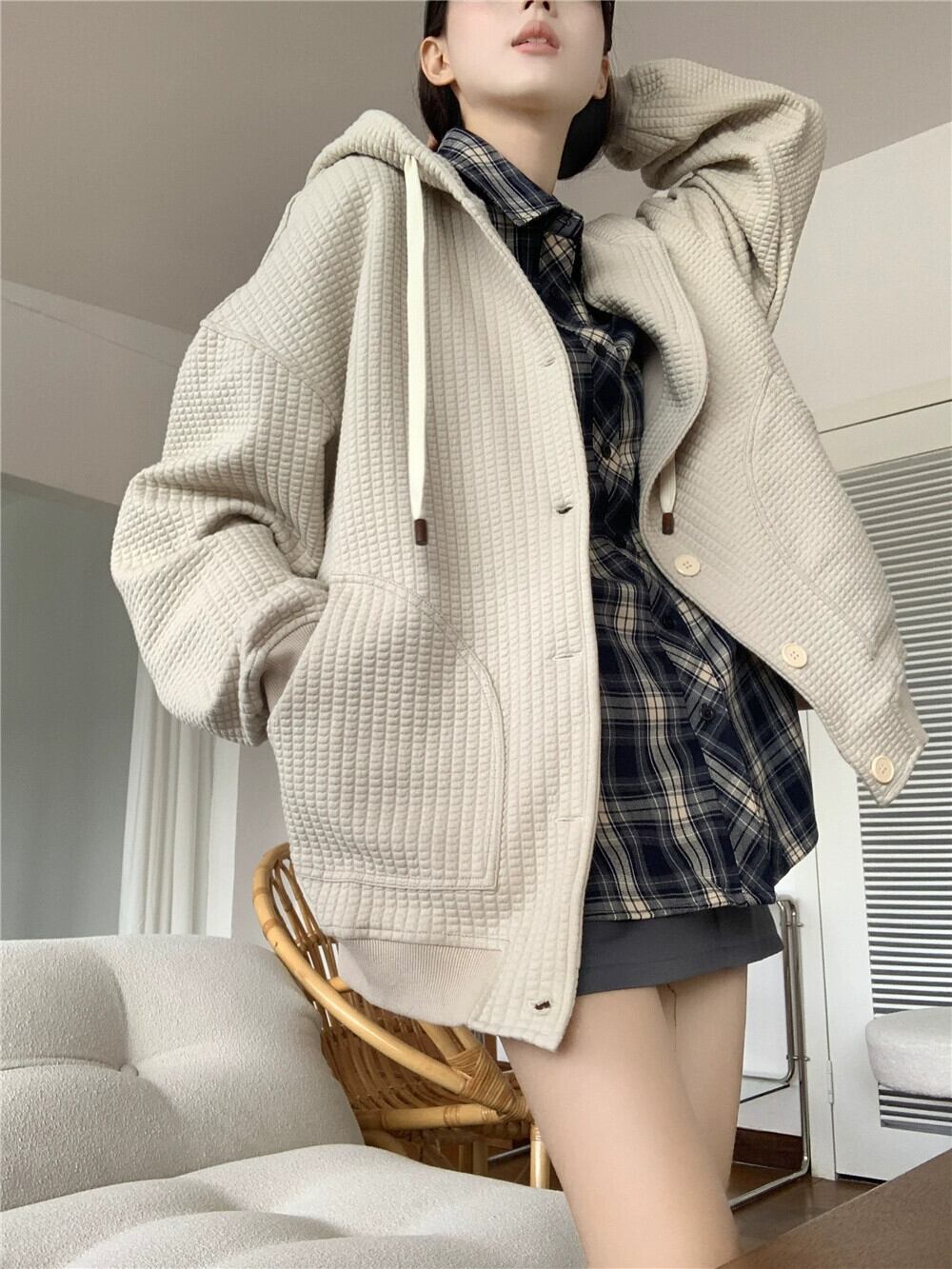 ルーズで怠惰なスタイルのフード付きカーディガンワッフルスウェットシャツ女性秋ニッチ長袖アウターミッドレングスコートトップ ロング オータム 秋物 bstraw89776496496 | beaute25