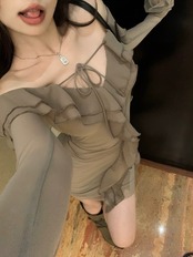 純粋な欲望スタイルのセクシーなワンショルダー長袖ドレス女性の秋のメッシュスカートスリムフリルヒップハグショートスカート ロング オータム 秋物 bstraw24415185822 | beaute25