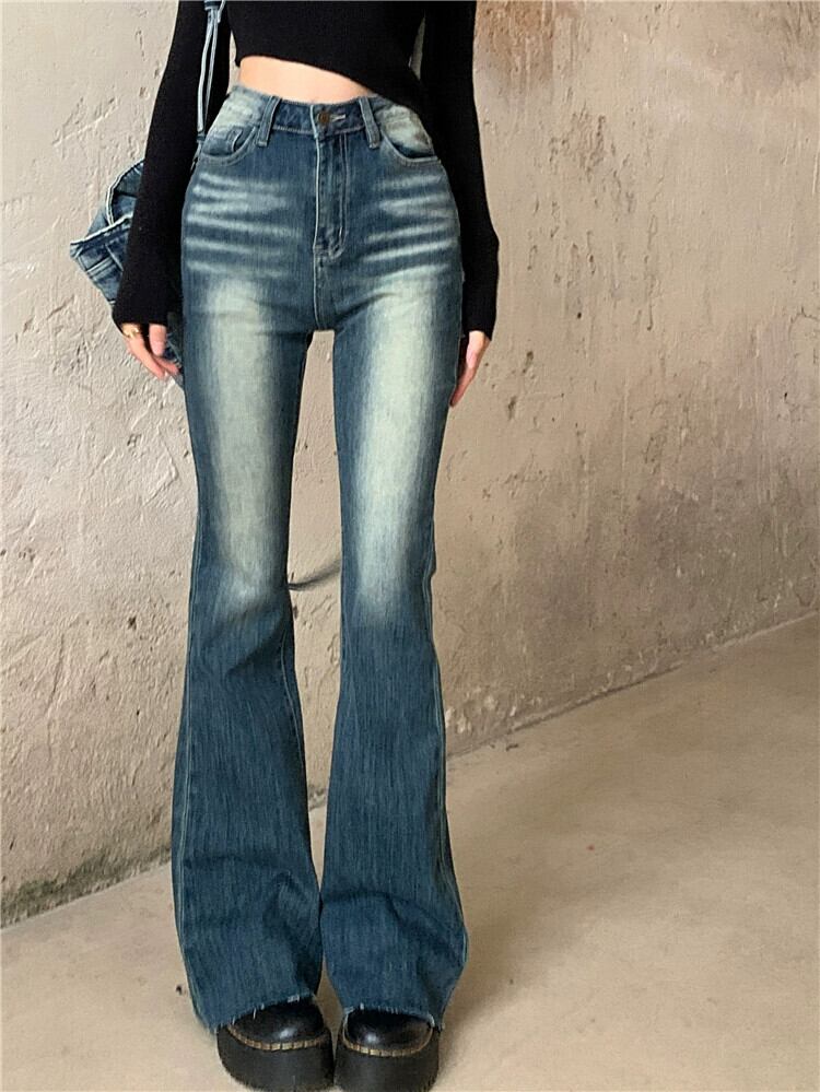 秋のアメリカのレトロなネクタイ ジーンズの女性、小さい、ハイウエスト、床までの長さのズボン、スリム ストレート、わずかにフレアのズボン レッド オータム 秋物 bstraw71370516530 | beaute25