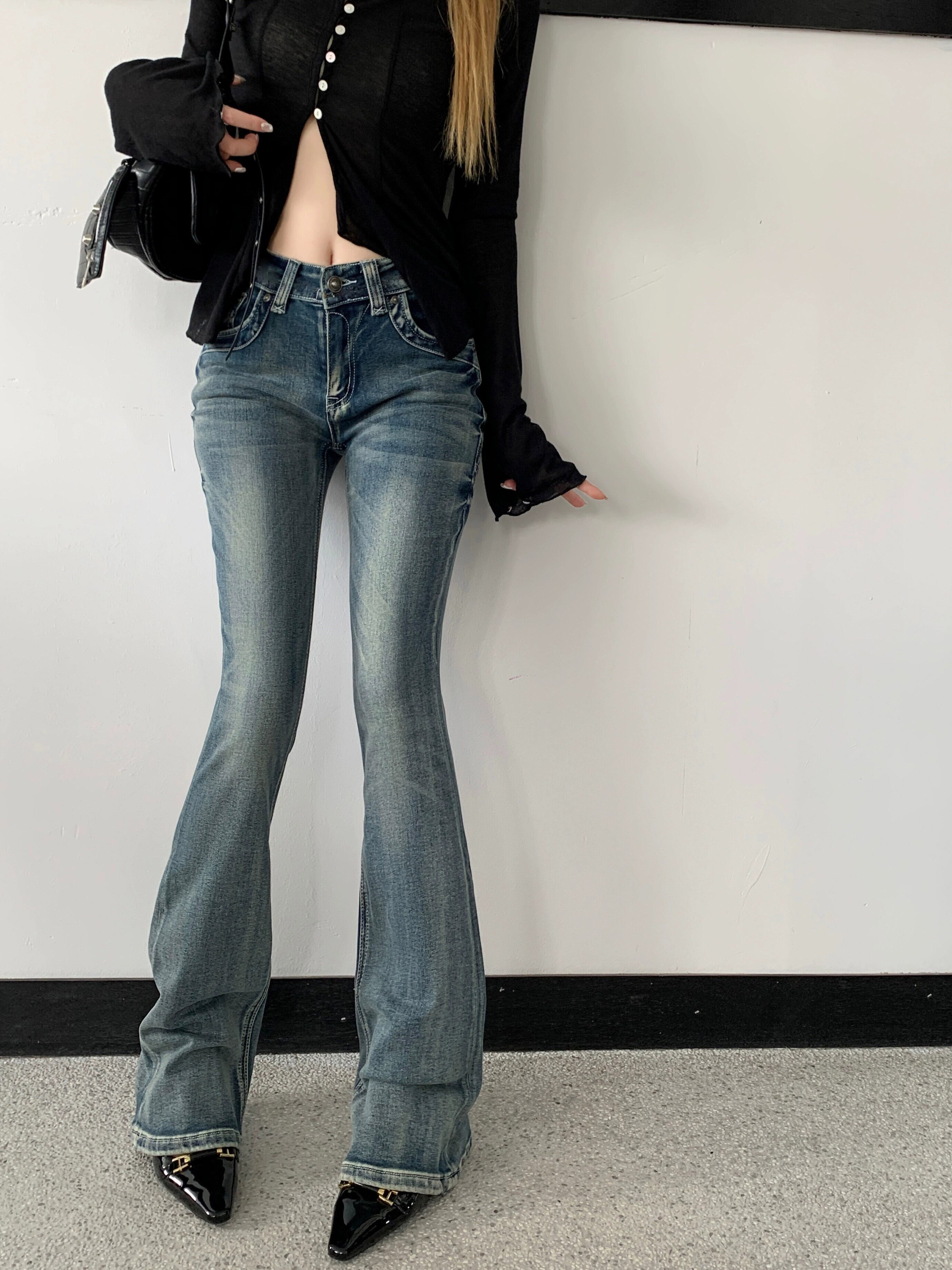 秋のアメリカのハイストリート ジーンズの女性、小さなパンツ、ローウエスト弾性ストレート マイクロ フレア フロアレングス パンツ レッド エラスティック 伸縮 オータム 秋物 bstraw65908549301 | beaute25