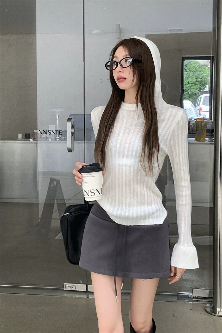 白いフード付き Tシャツボトリングシャツ女性秋トランペット長袖プルオーバーセーター薄いスリムフィットタイトトップ ロング ホワイト オータム 秋物 bstraw38018044314 | beaute25