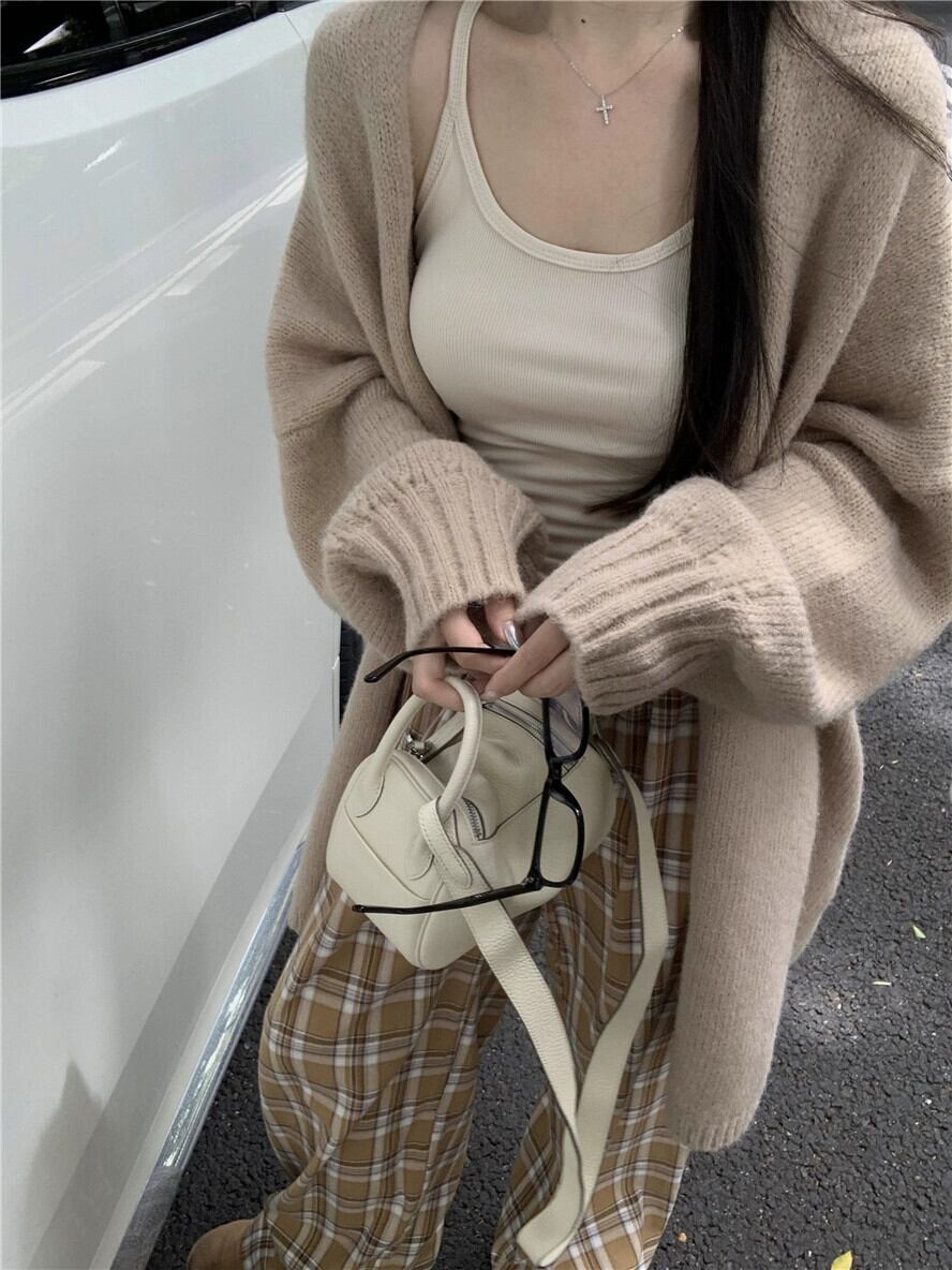 色:アプリコットカーディガン,アプリコットカラーの内装,黄色のチェック柄パンツ