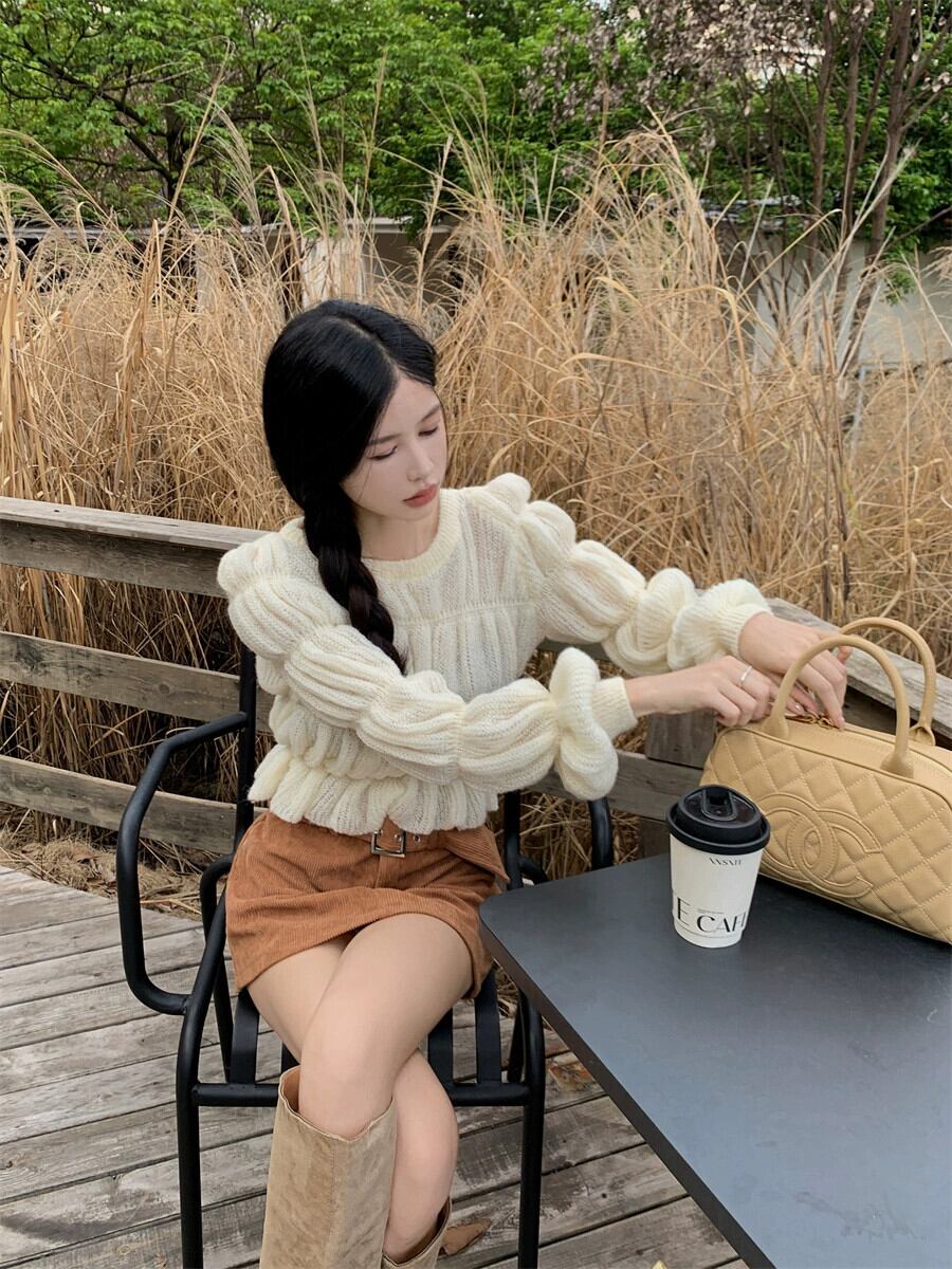 優しい気質、柔らかくワックスのようなランタンスリーブセーターレディース、秋シック、スリム、ショート、甘い、長袖セータートップ ロング 大人ガーリー スウィート キュート カジュアル オータム 秋物 bstraw12732768562 | beaute25
