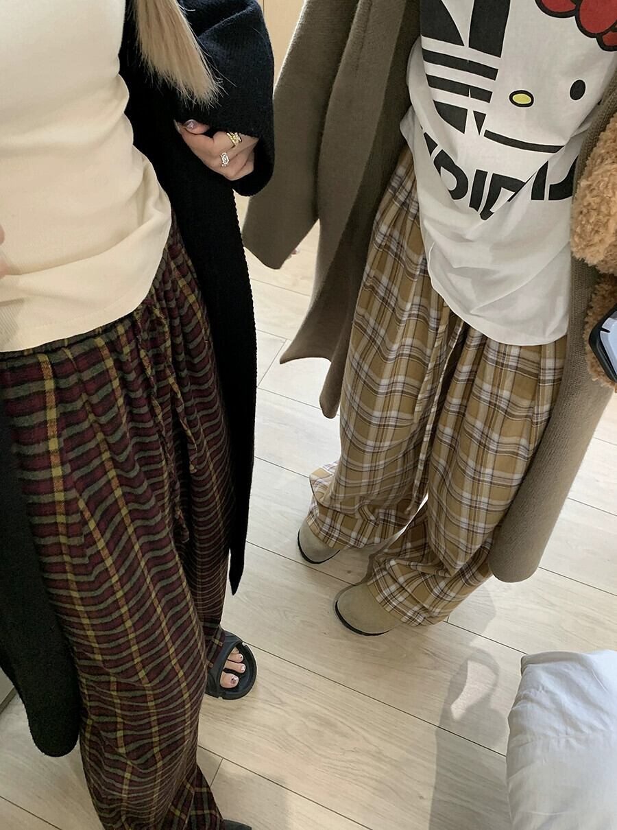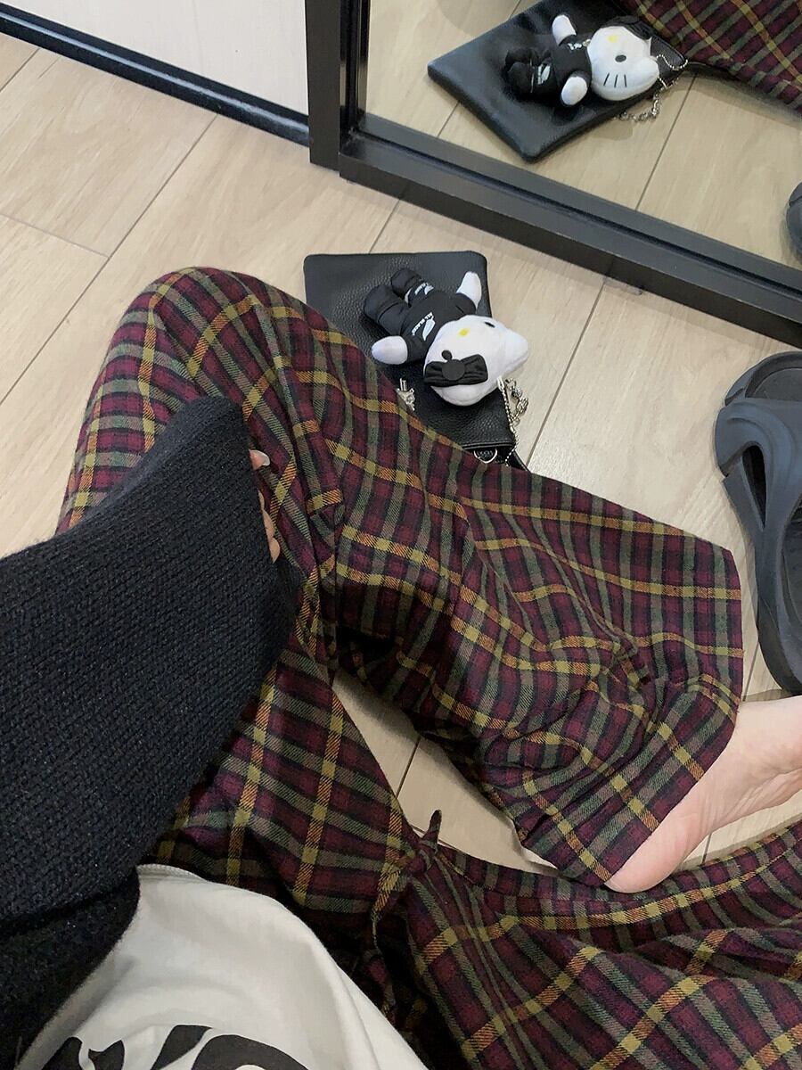 色:ブラックカーディガン,キャメルカーディガン,黄色のチェック柄のズボン,赤い格子縞のズボン