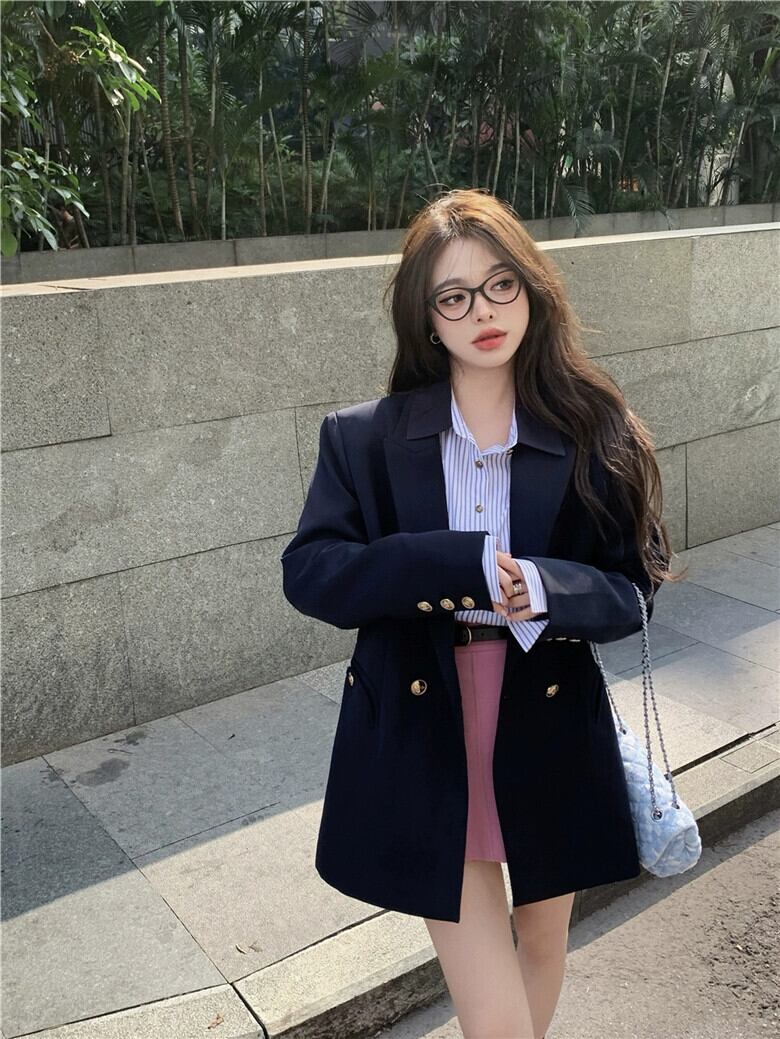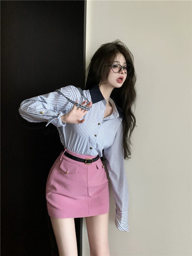 色:ストライプシャツ,ベルト付きピンクスカート,紺のスーツ