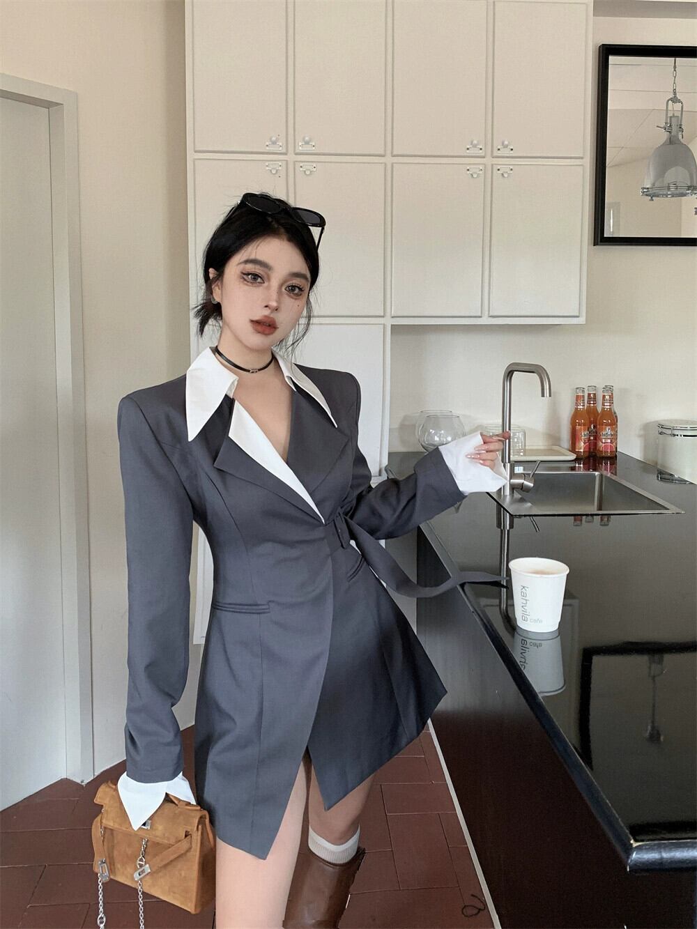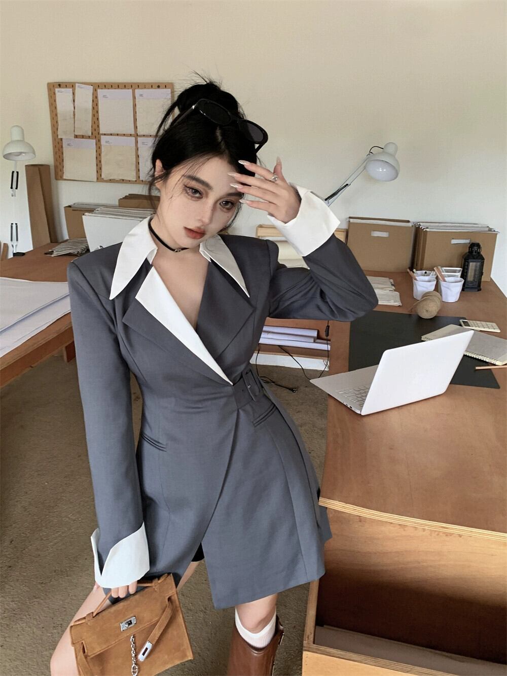 スタイル気質長袖スーツドレス女性の秋のハイエンドコントラストステッチスカートウエスト A ラインショートスカート ロング オータム 秋物 Aライン bstraw74705669518 | beaute25