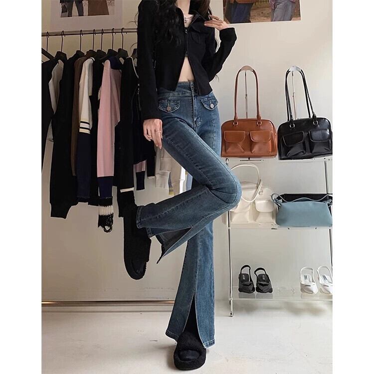 秋のレトロなネクタイ ジーンズの女性、小さい、ハイウエストの伸縮性のあるスリット パンツ、スリム ストレート、わずかにフレアのズボン レッド オータム 秋物 bstraw56451159142 | beaute25
