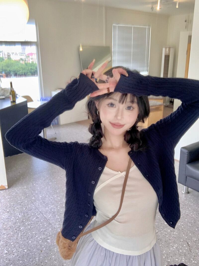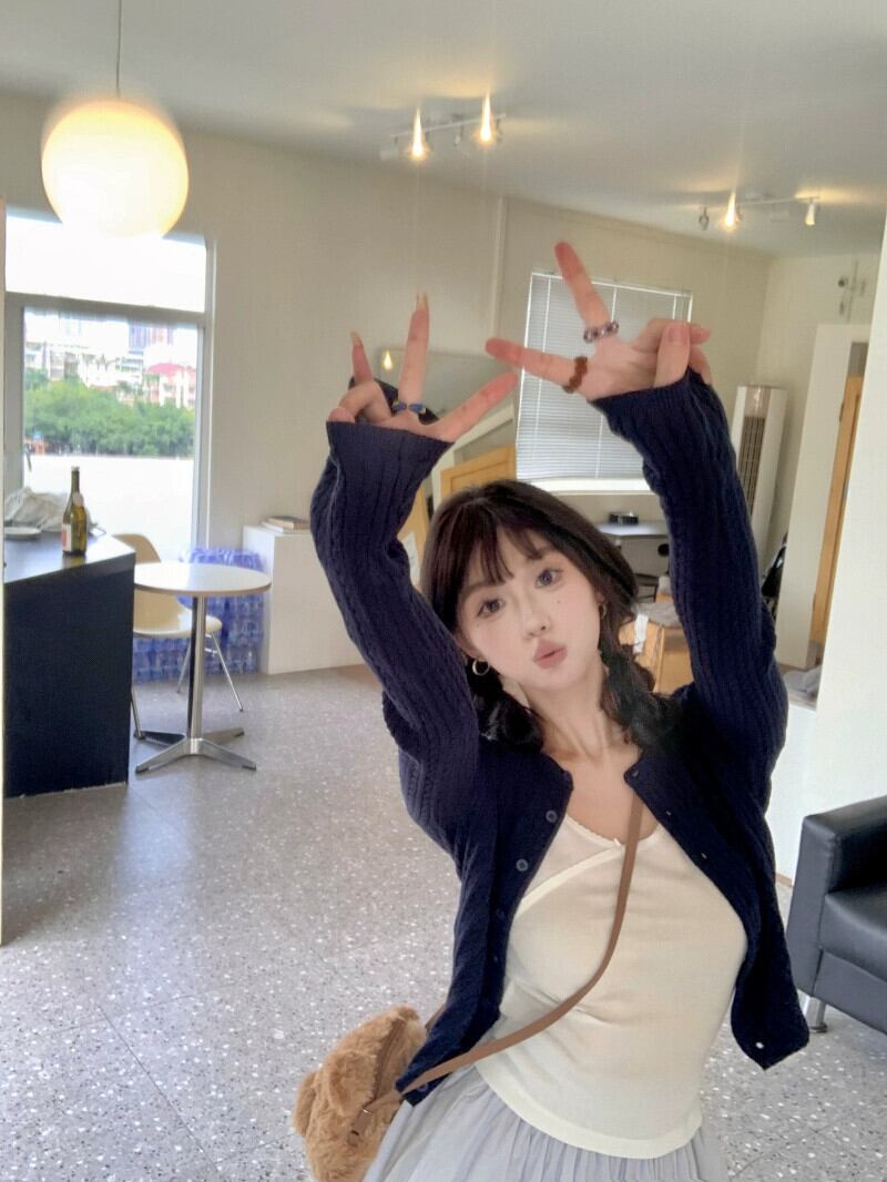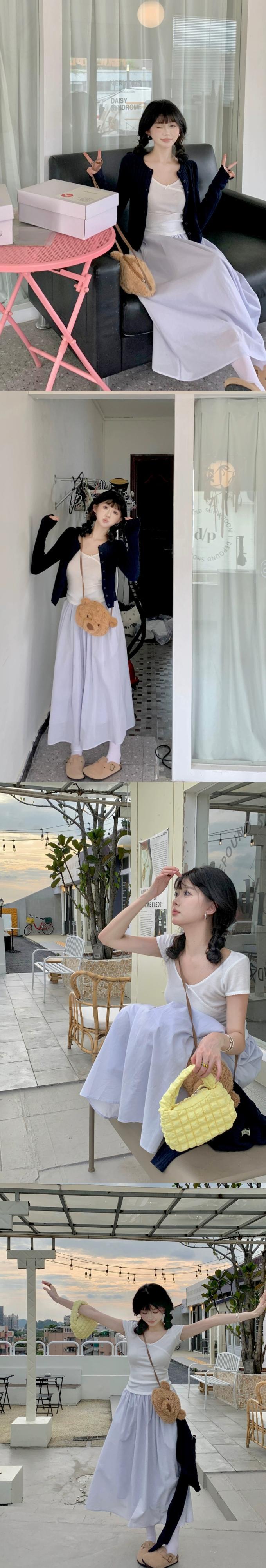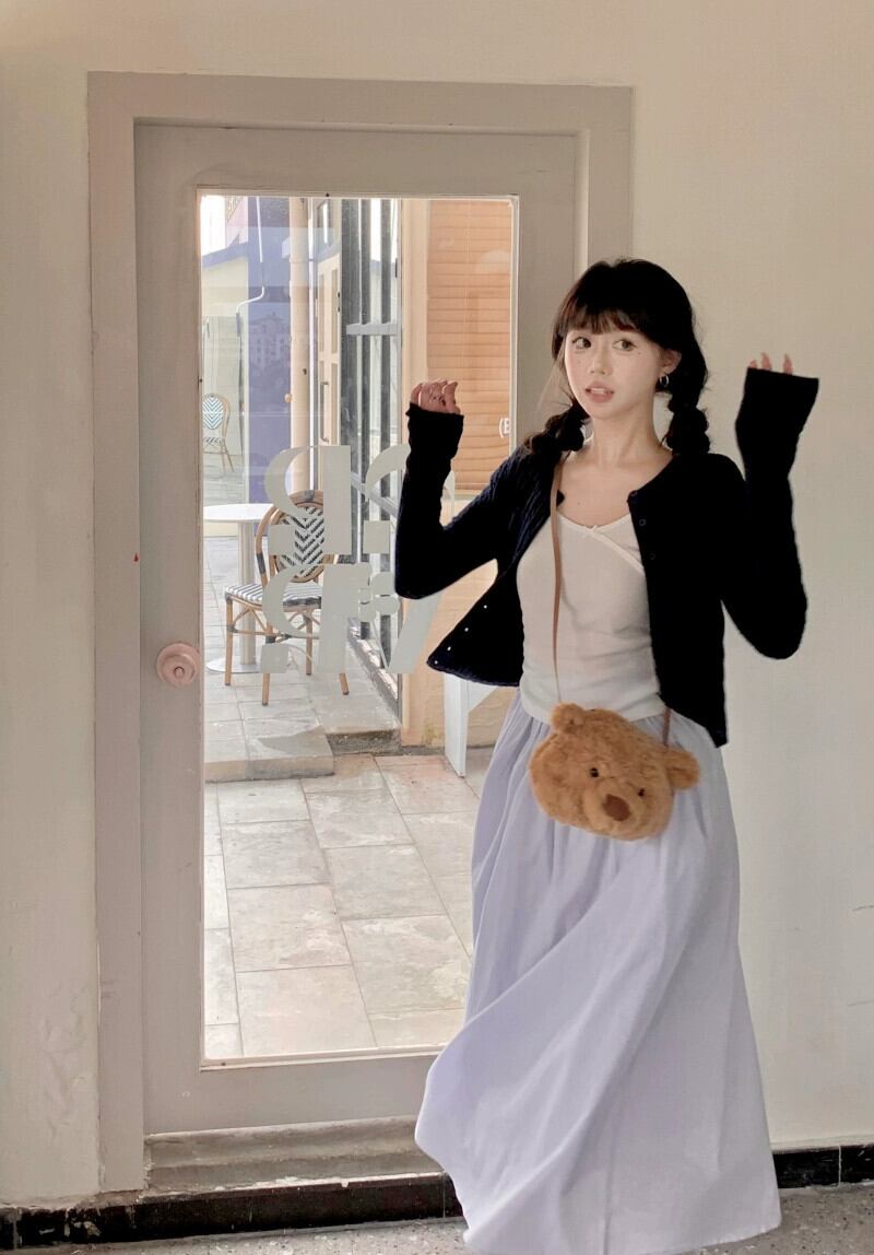 色:ツイストカーディガン,ボウホワイトT,青と紫のスカート