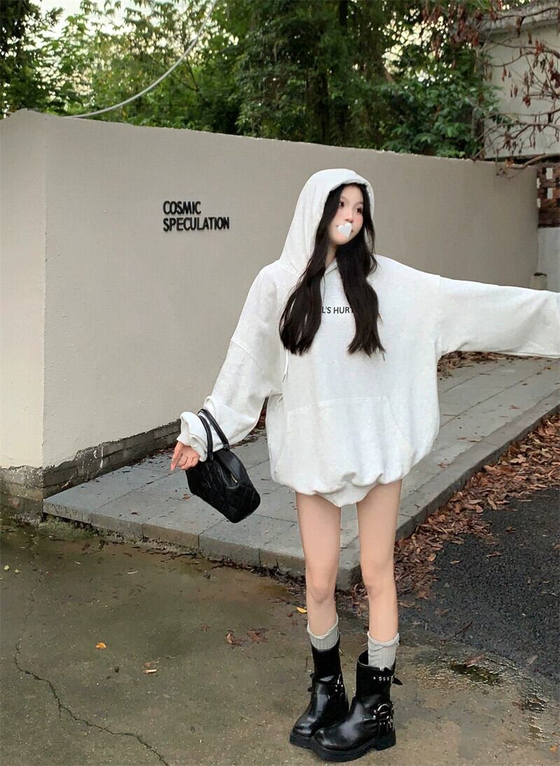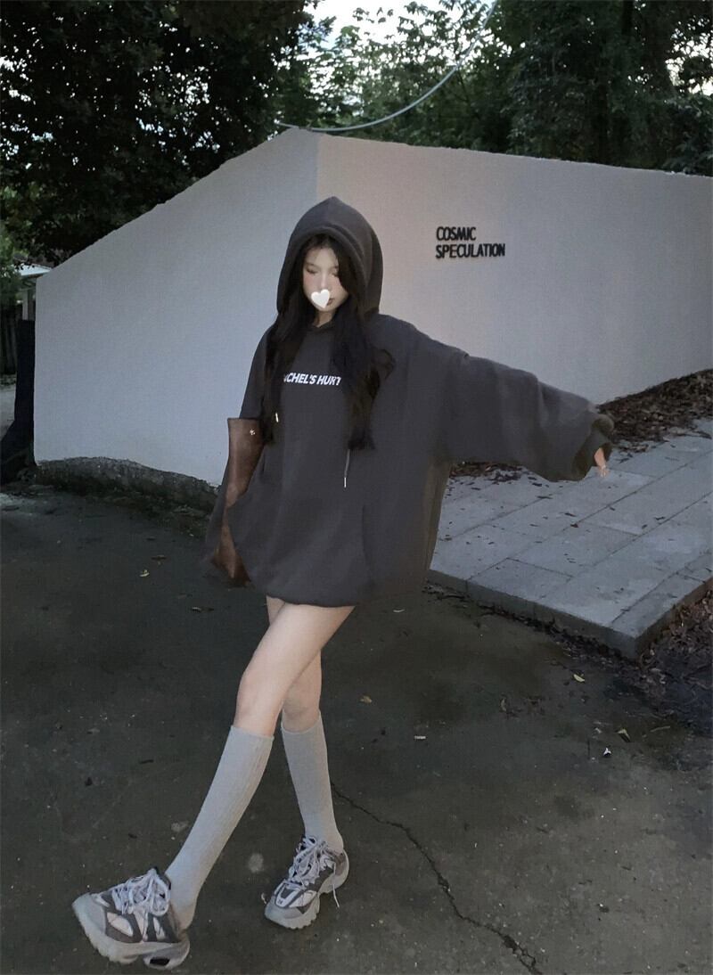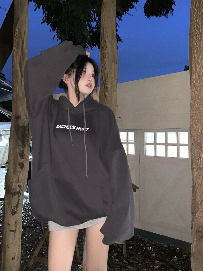 グレーの長袖フード付きスウェットシャツの女性、秋と冬のルーズなプルオーバーコート、怠惰なスタイル、ミッドレングスのレタープリントトップ ロング オータム 秋物 ウィンター 冬物 bstraw79357573900 | beaute25