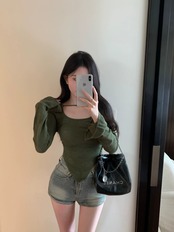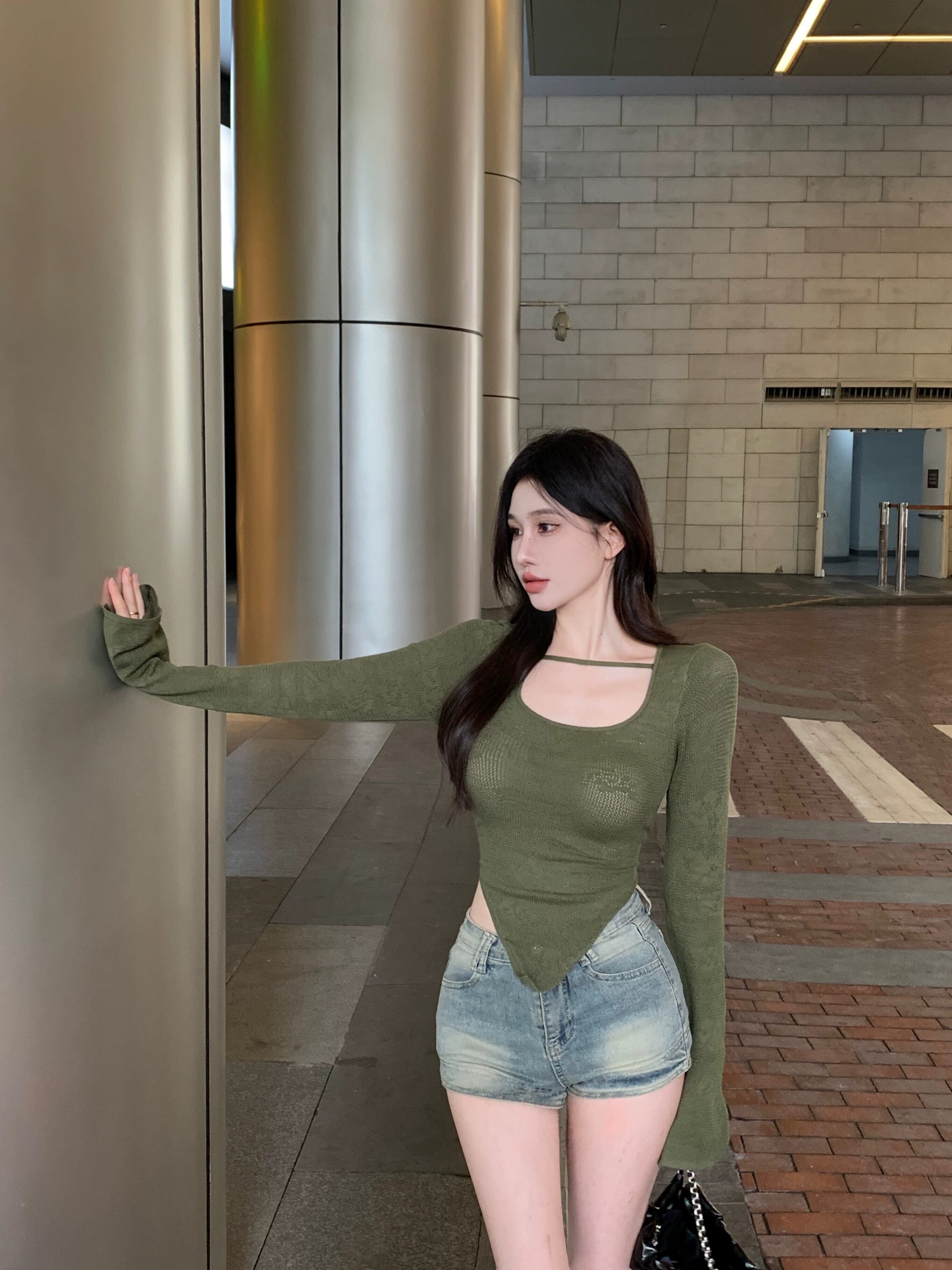 純粋な欲望グリーンスクエアネック長袖右肩ニットセーター女性の秋薄い底シャツスリムフィットウエスト不規則なトップ ロング オータム 秋物 スクウェア bstraw7448666524 | beaute25