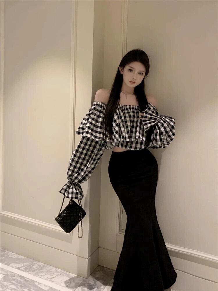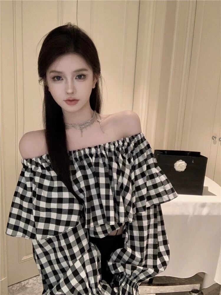 フランスのレトロなワンショルダーチェック柄長袖シャツの女性、秋のゆったりとしたショートシャツ、優しい気質と美しいトップス ロング オータム 秋物 bstraw58083225839 | beaute25