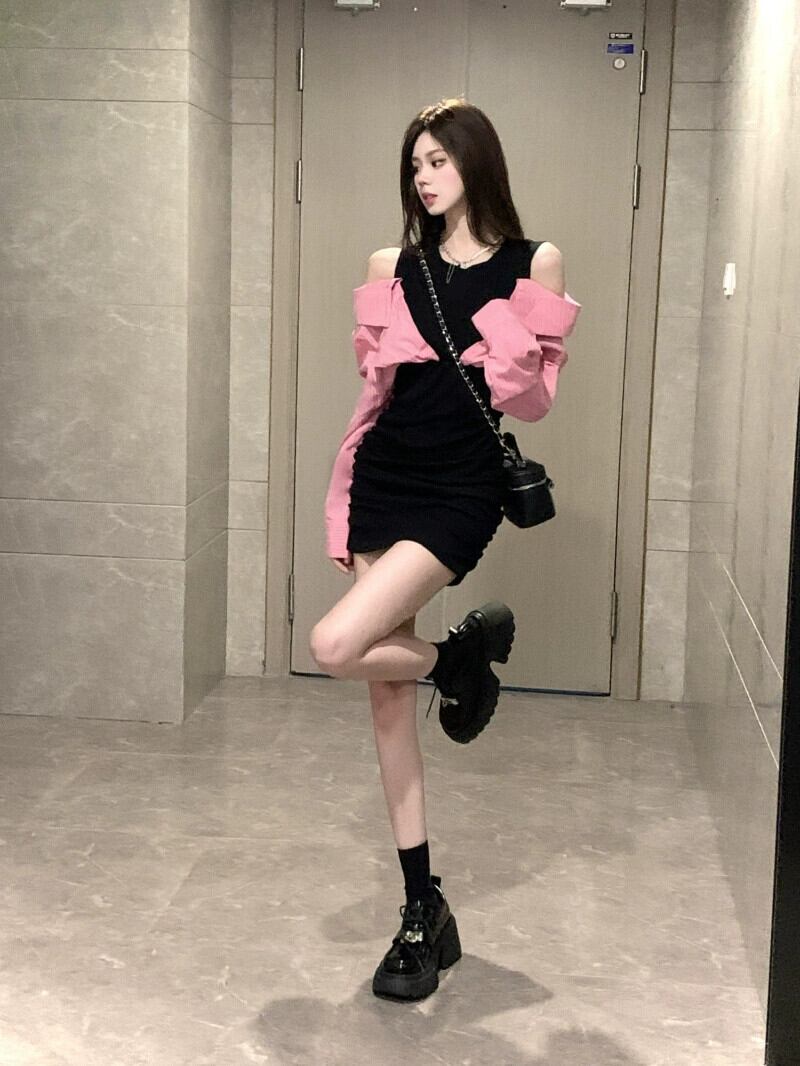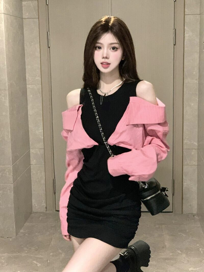 初秋の純粋な欲望の偽のツーピースの長袖ドレスの女性、甘酸っぱいスカート、ハイエンドのオフショルダーの気質、腰を覆う短いスカート ショート ロング 大人ガーリー スウィート キュート カジュアル オータム 秋物 bstraw44767342075 | beaute25