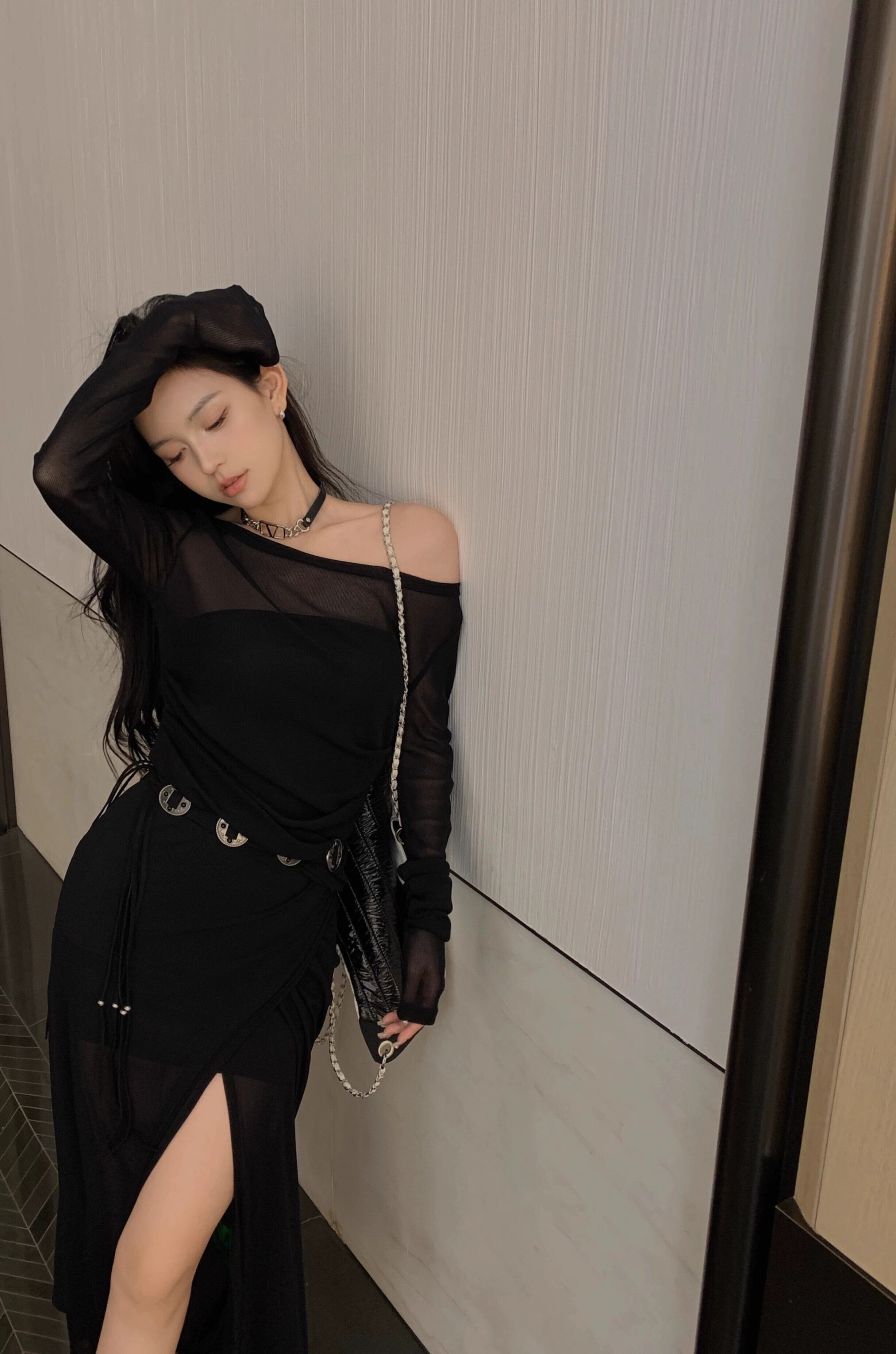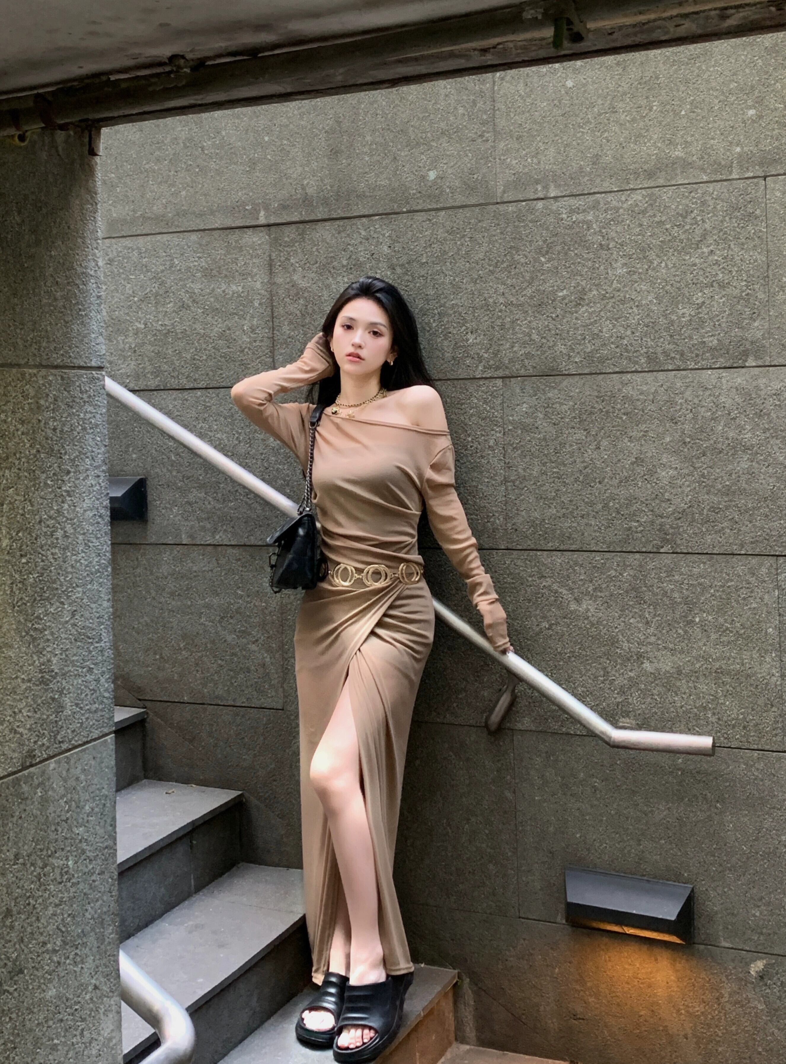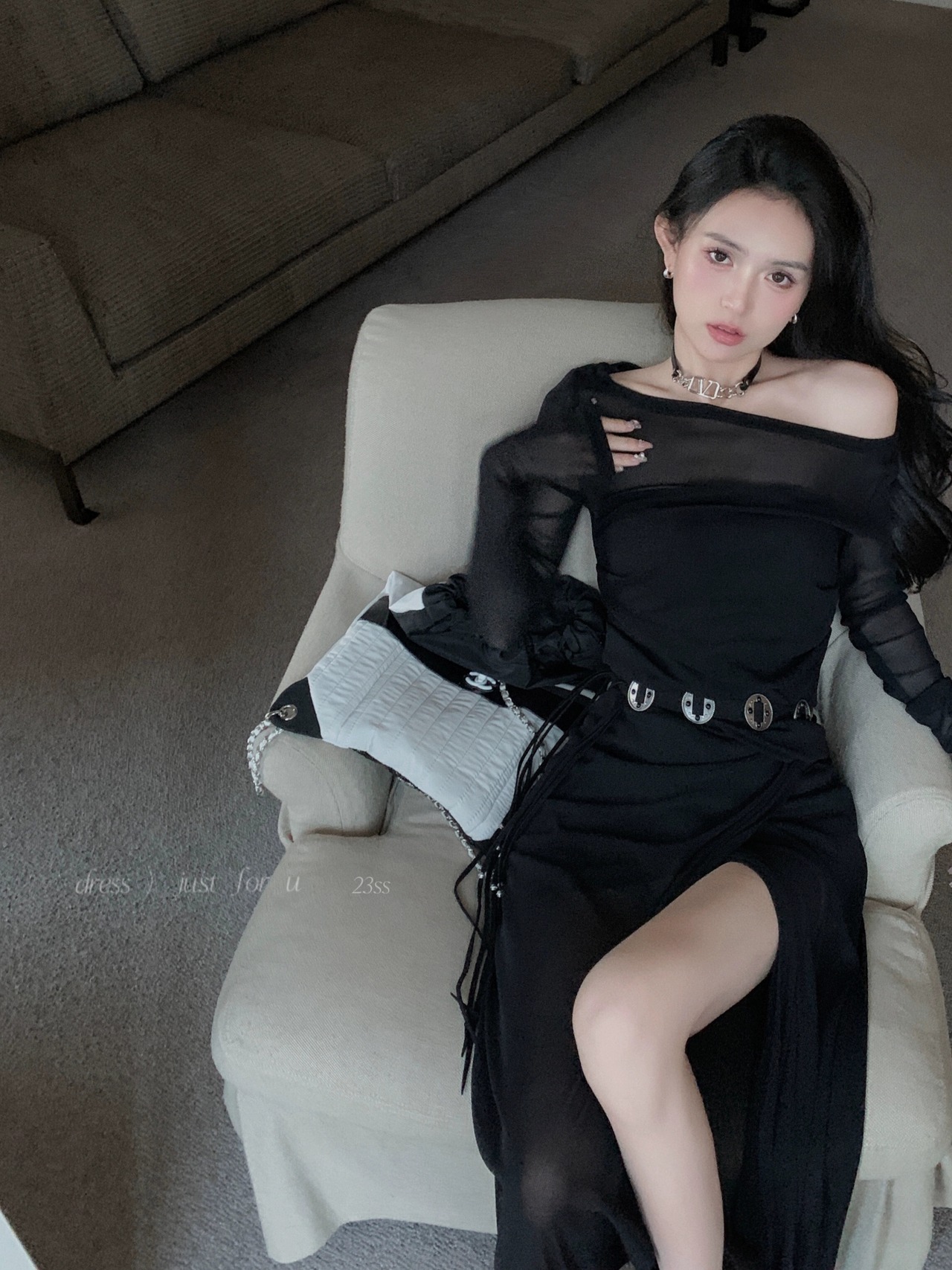 初秋のワンショルダー長袖メッシュドレスレディース、レトロなネクタイスカート、ウエストを締めるプリーツドレープスリットロングスカート オータム 秋物 bstraw97049974340 | beaute25