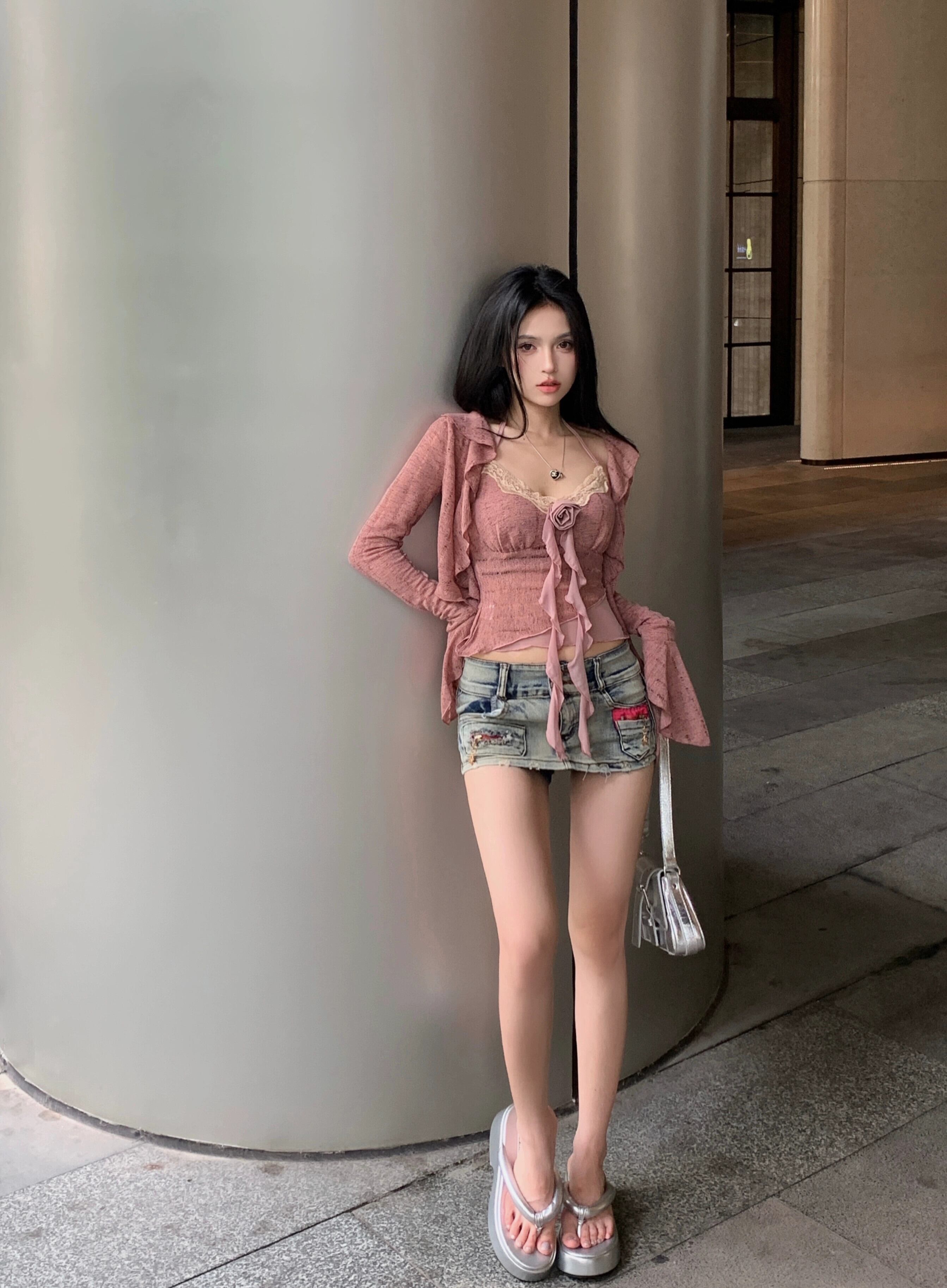 色:ピンクのサスペンダー,コーヒー色のスリング,ピンクのカーディガン,コーヒー色のカーディガン