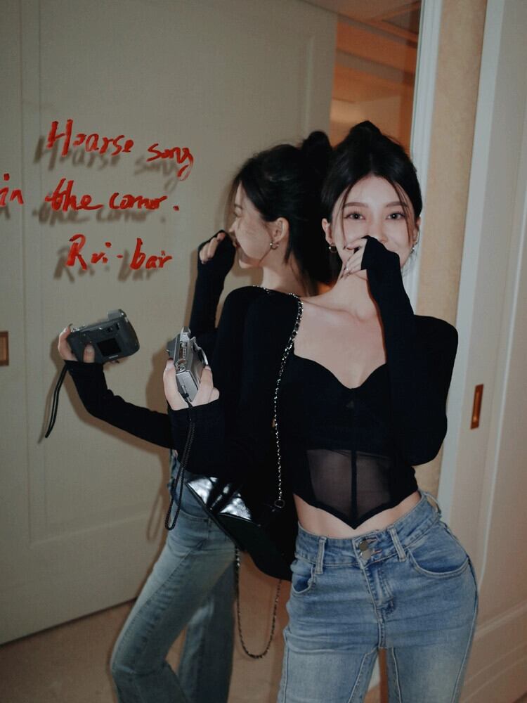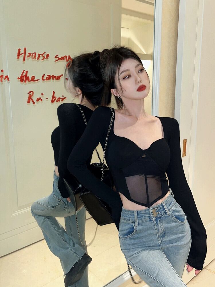 甘いホットガールスクエアネックメッシュ長袖 Tシャツ女性の初秋 2023 セクシーなスリムショートトップボトリングシャツ ロング 大人ガーリー スウィート キュート カジュアル オータム 秋物 スクウェア bstraw62761849056 | beaute25