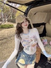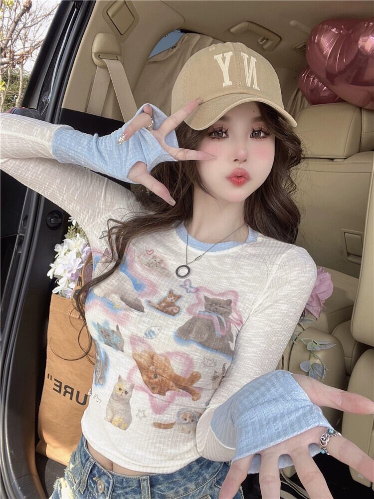 甘い猫プリント長袖 Tシャツ女性の秋 y2k 日焼け止めスリムデザインショートトップボトリングシャツ ロング 大人ガーリー スウィート キュート カジュアル オータム 秋物 bstraw47203030805 | beaute25