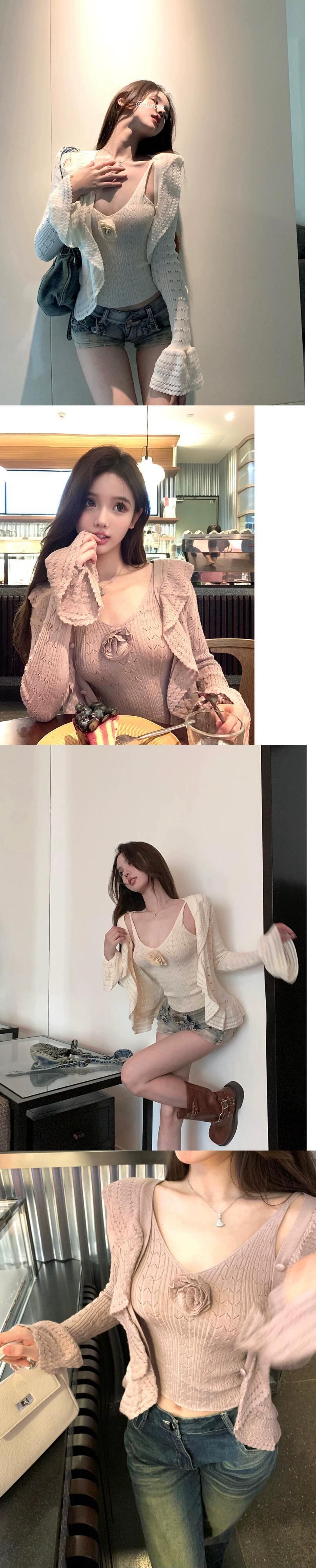 ピンクのニットカーディガンジャケットの女性の秋のスーツ純粋な欲望の立体的な花のホルタートップの2点セット オータム 秋物 ピュア フラワーデザイン bstraw37331646996 | beaute25