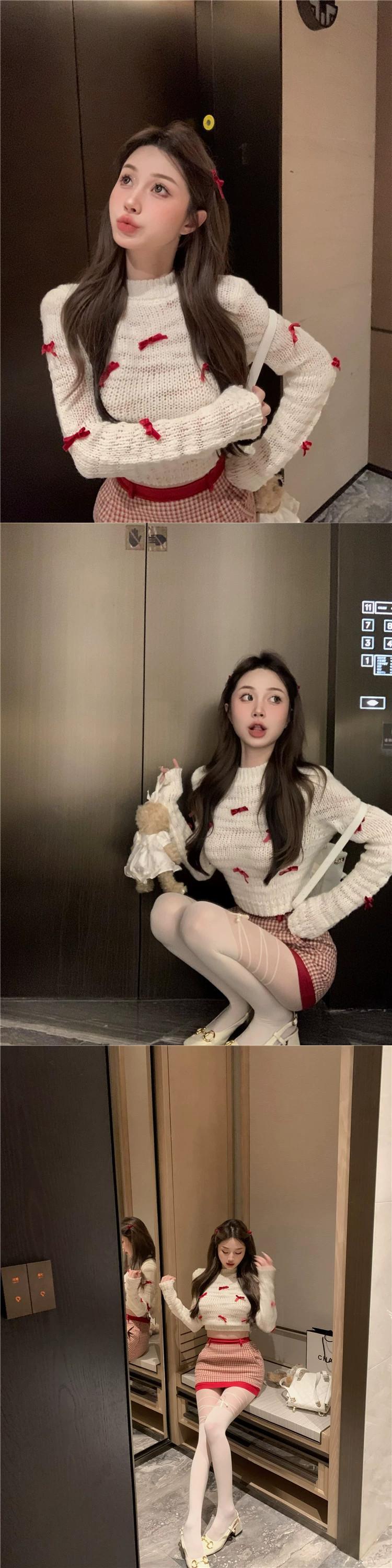 色:白いセーター,チェック柄スカート