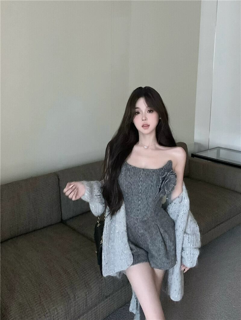 グレー長袖ルーズセーターカーディガンコート秋スーツチューブトップベスト付きレディースカジュアルショーツ3点セット ロング オータム 秋物 ブルマー bstraw36339204652 | beaute25