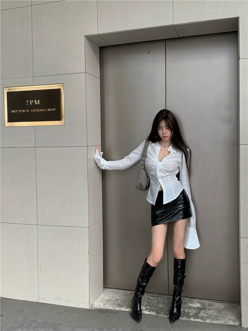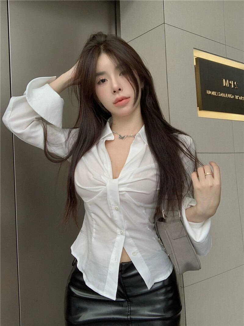 白い V ネック長袖シャツの女性、秋のフレンチシックなシャツ、スリムウエスト、プリーツデザイン、ニッチトップ ロング ホワイト オータム 秋物 Vネック bstraw52203891729 | beaute25