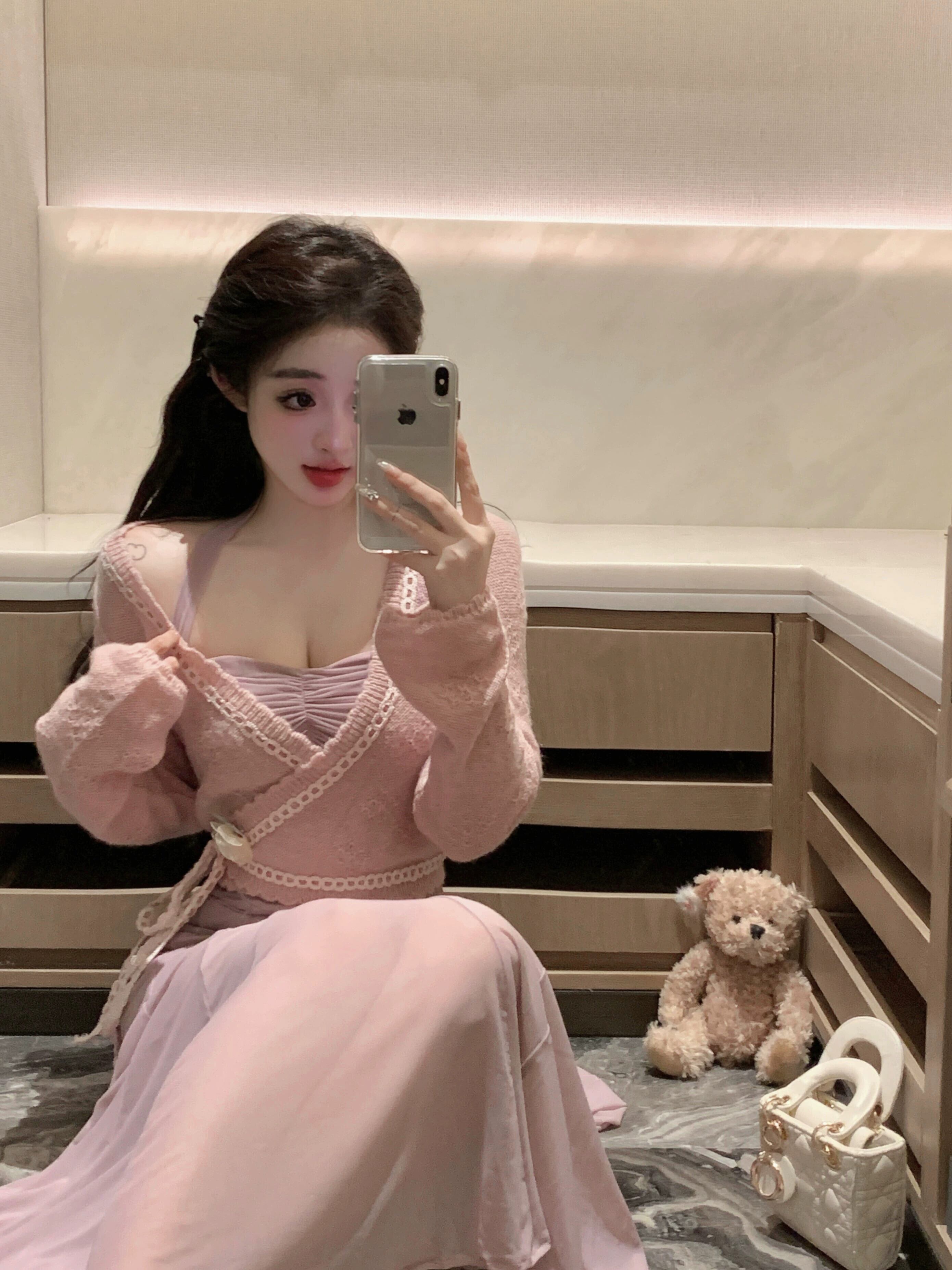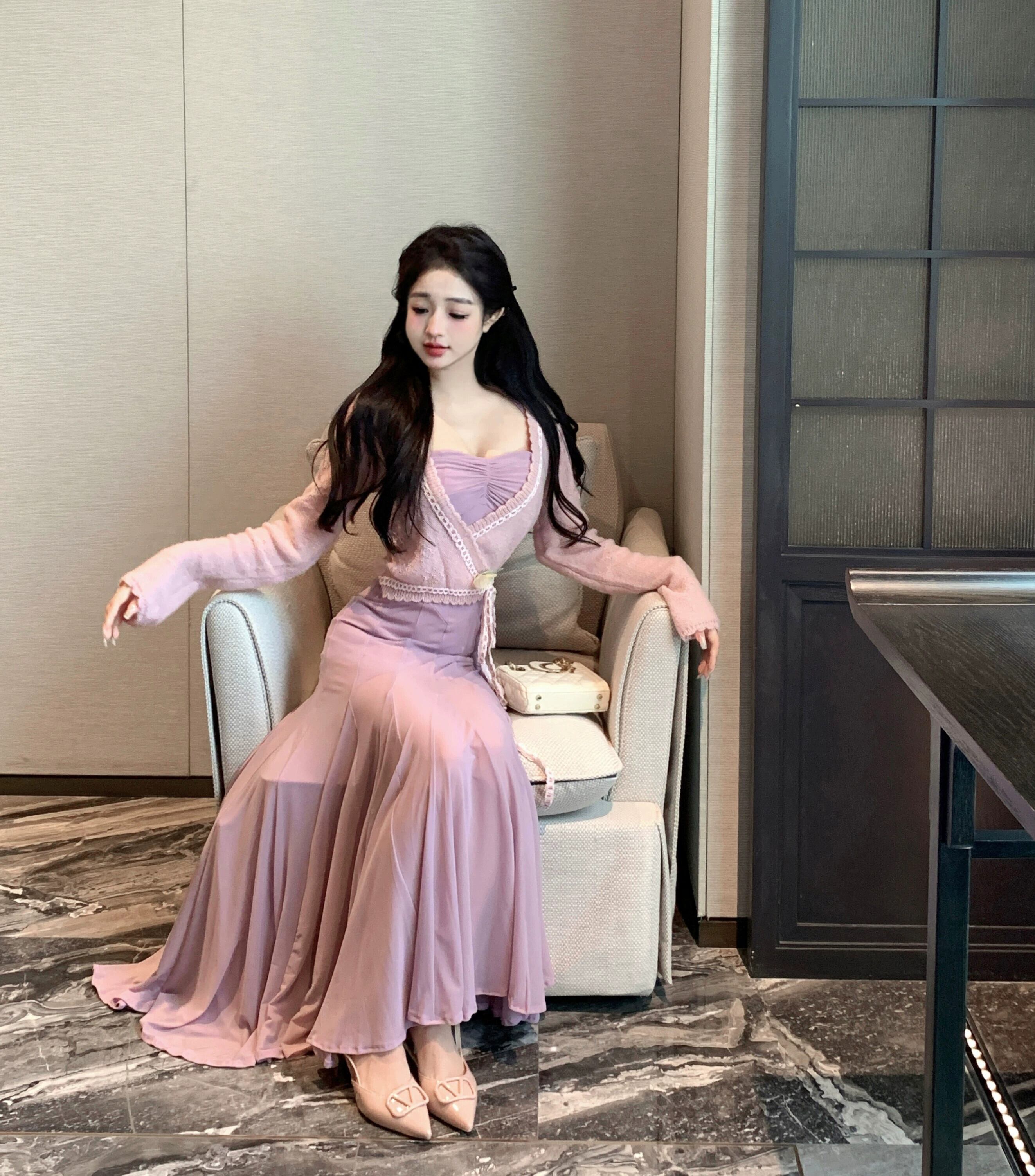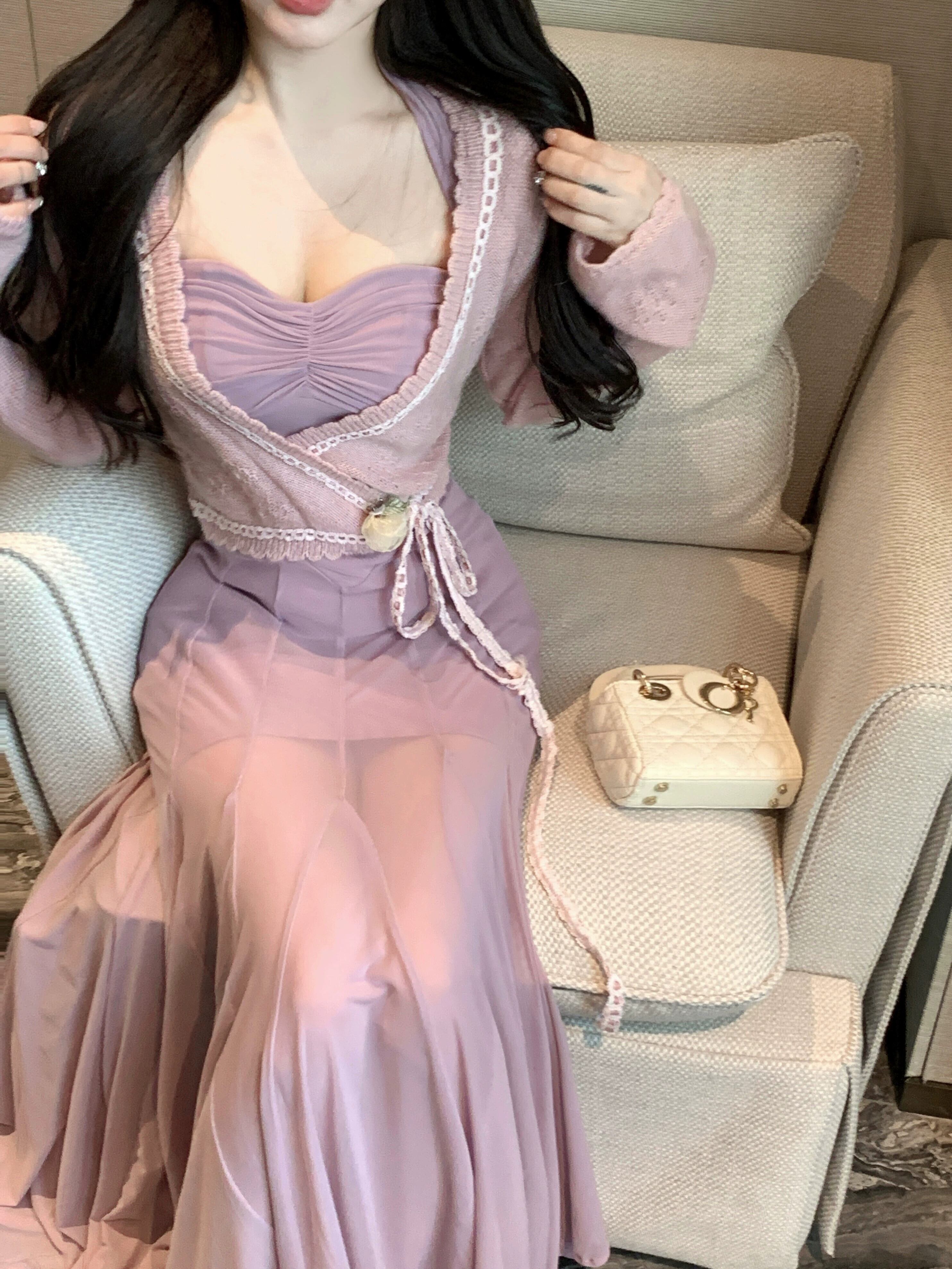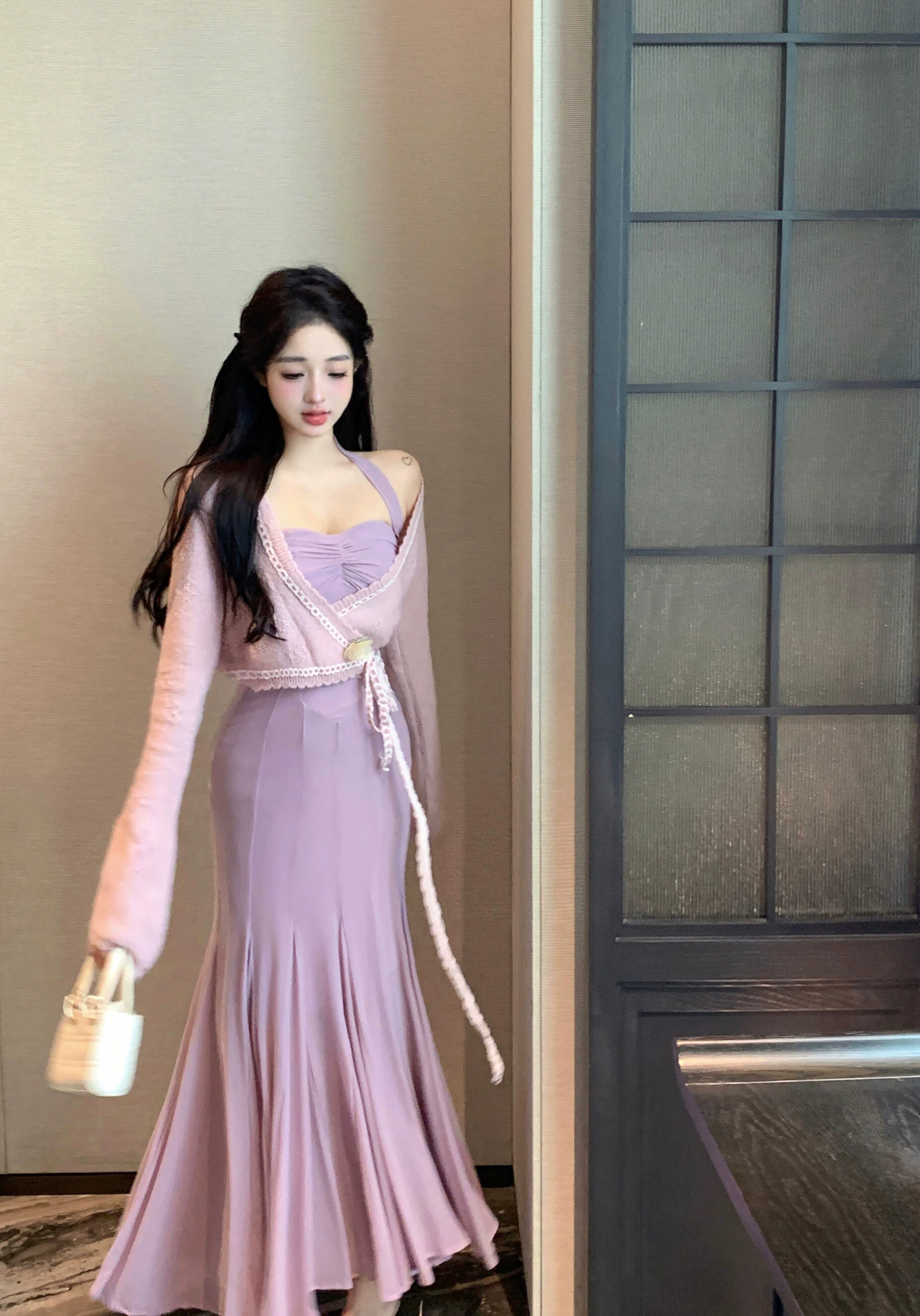 純粋な欲望スタイルショート長袖ニットカーディガン女性秋パープルホルターネックドレスフィッシュテールロングスカートツーピースセット オータム 秋物 bstraw56281319332 | beaute25