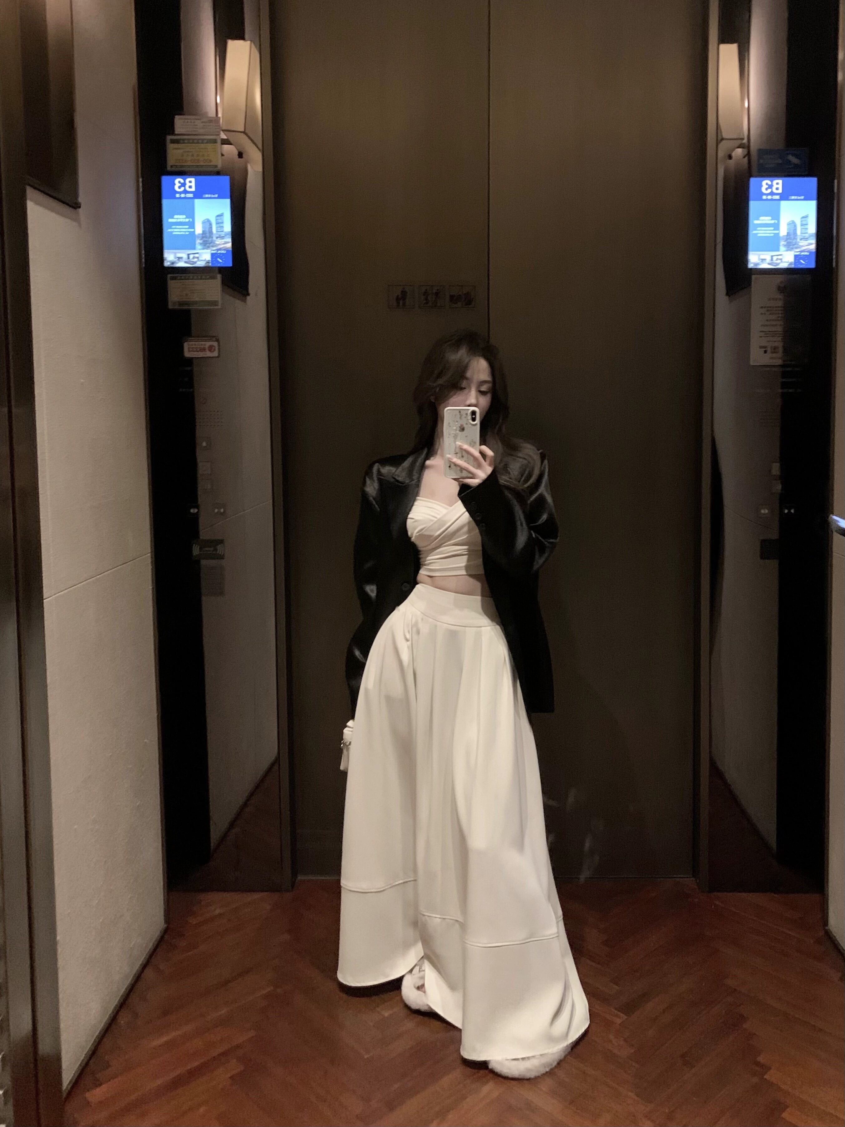ホワイト V ネック長袖 Tシャツ女性ハイウエスト A ラインスカートミドル丈スカートスーツルーズスーツジャケット 3 点セット ロング Vネック Aライン bstraw83548986006 | beaute25