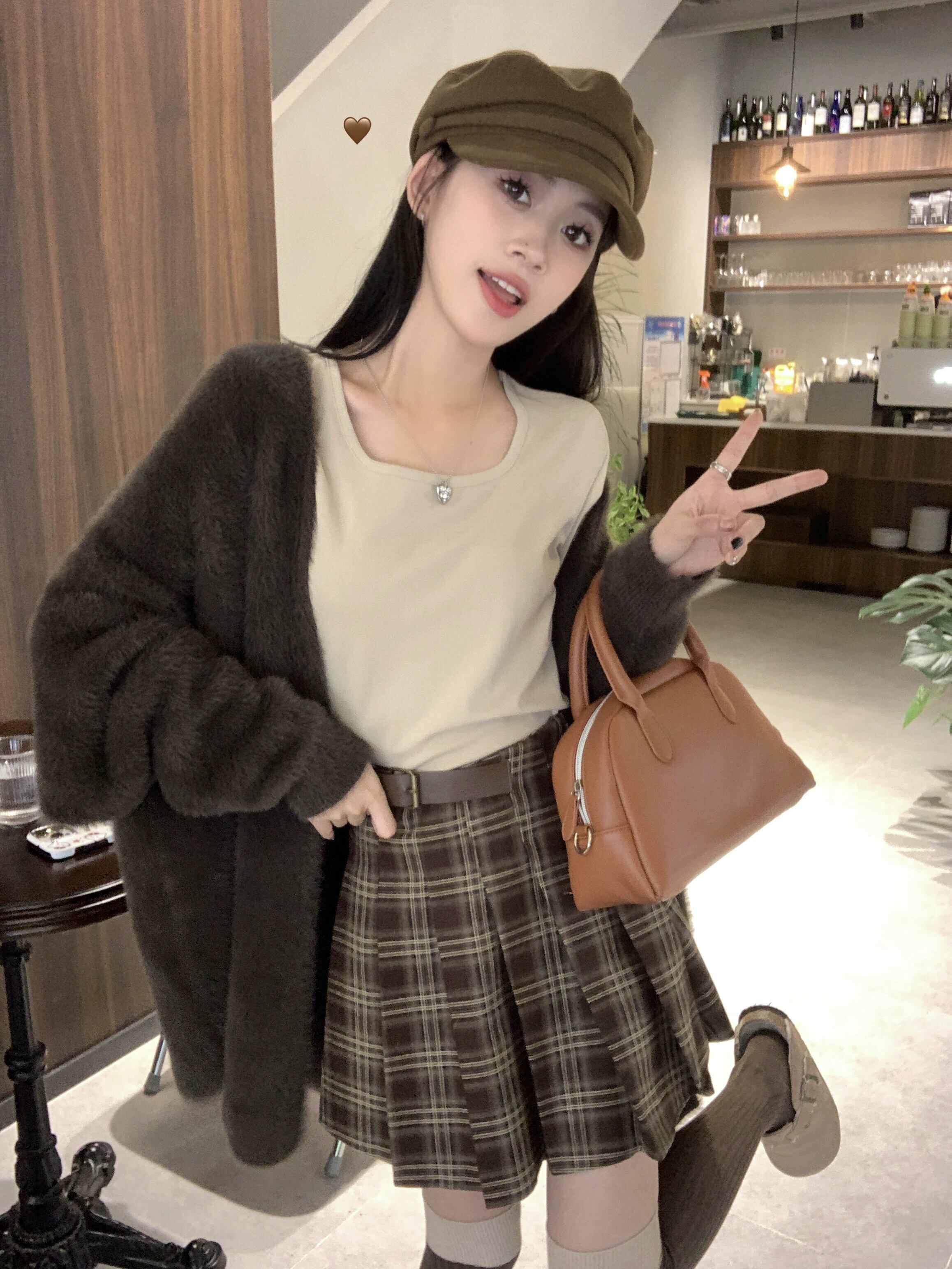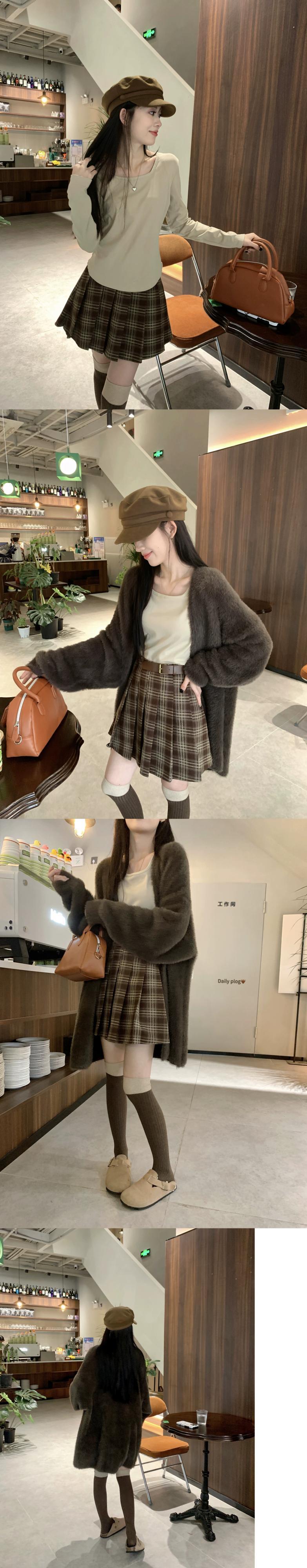 色:コーヒー色のカーディガン,ミルクティーカラーTシャツ,コーヒー色のスカート