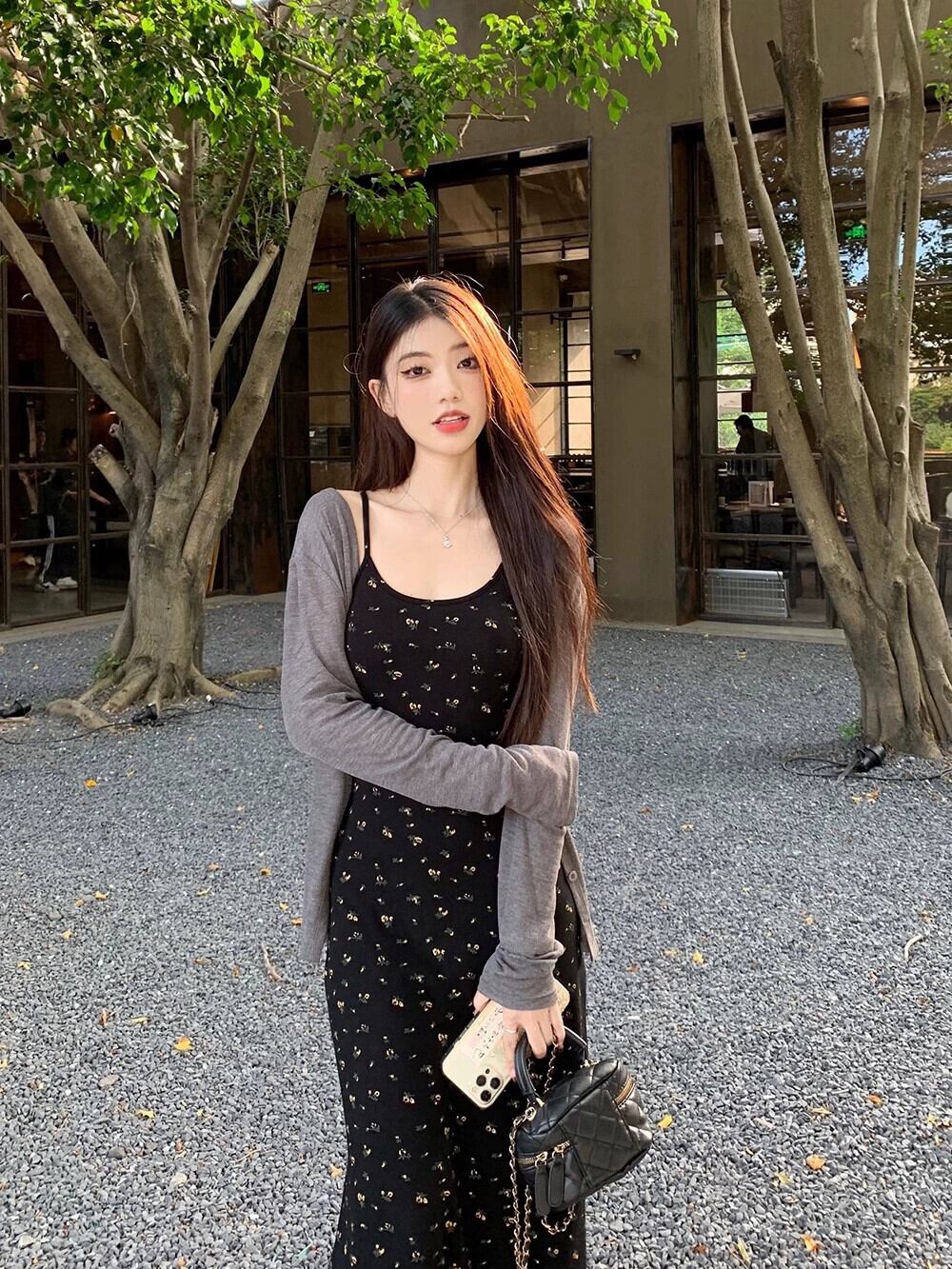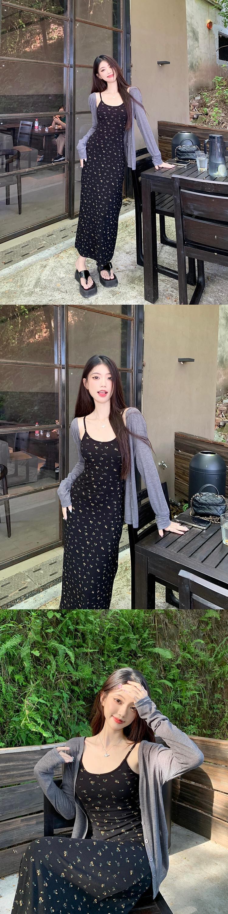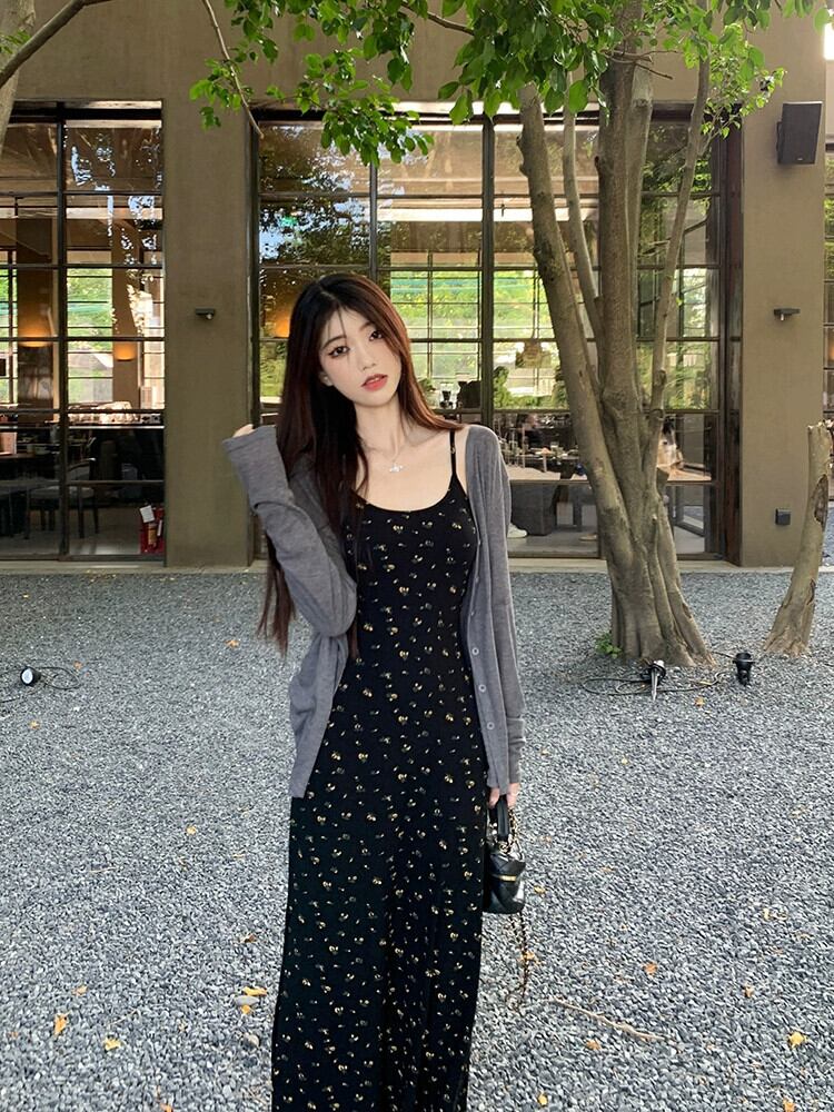 フレンチブラックの花柄ニットサスペンダードレス女性夏、ノースリーブ、タイトフィット、ヒップハグスカート、エレガントなロングスカート サマー 夏物 bstraw78304645603 | beaute25