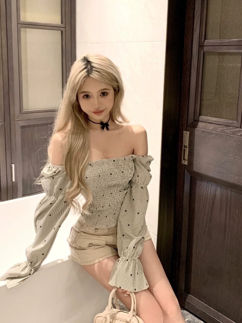 フレンチスイートチェック柄シャツ女性の秋のワンショルダーパフスリーブシャツホットガールスリムショート気質トップ 大人ガーリー スウィート キュート カジュアル オータム 秋物 bstraw62596190752 | beaute25