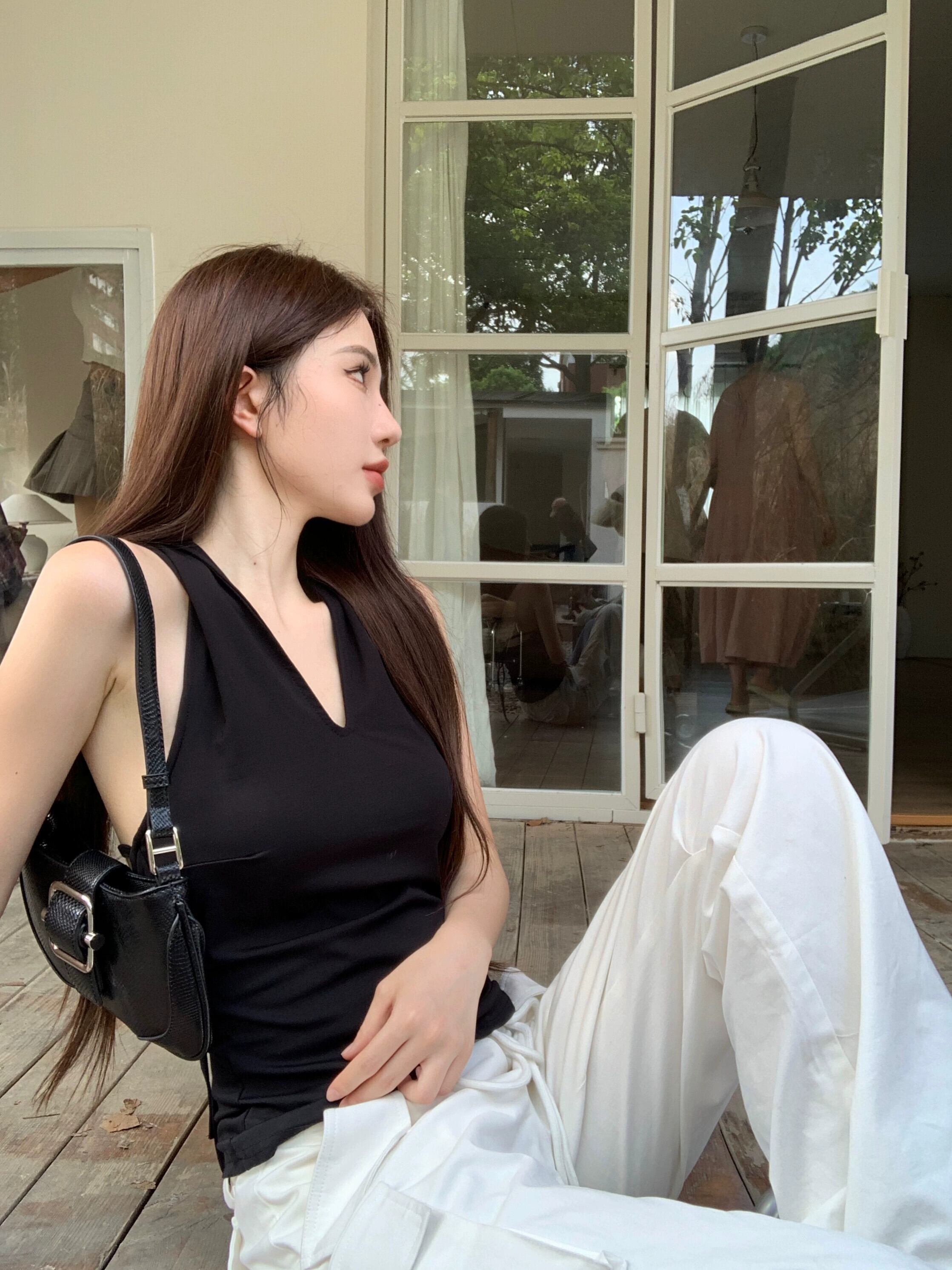 アメリカンレトロ甘くてクールなネクタイバックレス Tシャツ女性の夏のデザインホルターネックノースリーブベストフード付きブラックトップ 大人ガーリー スウィート キュート カジュアル サマー 夏物 bstraw78602237569 | beaute25