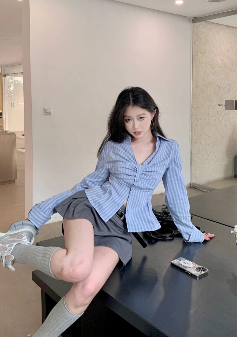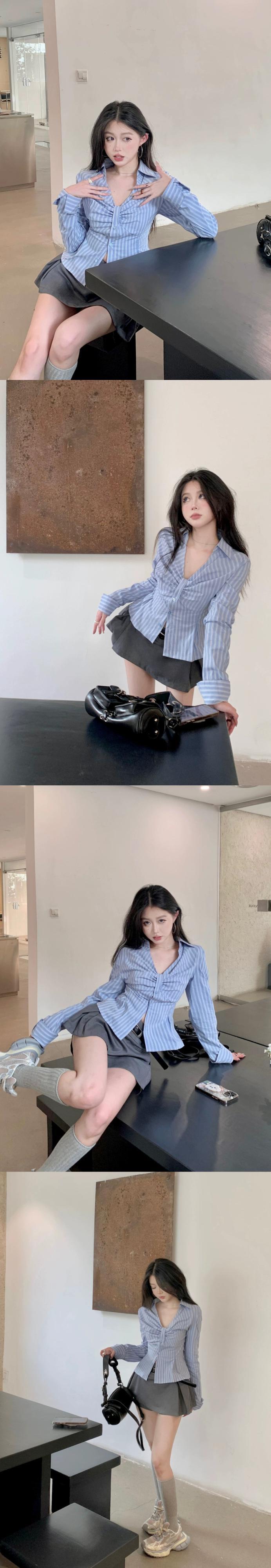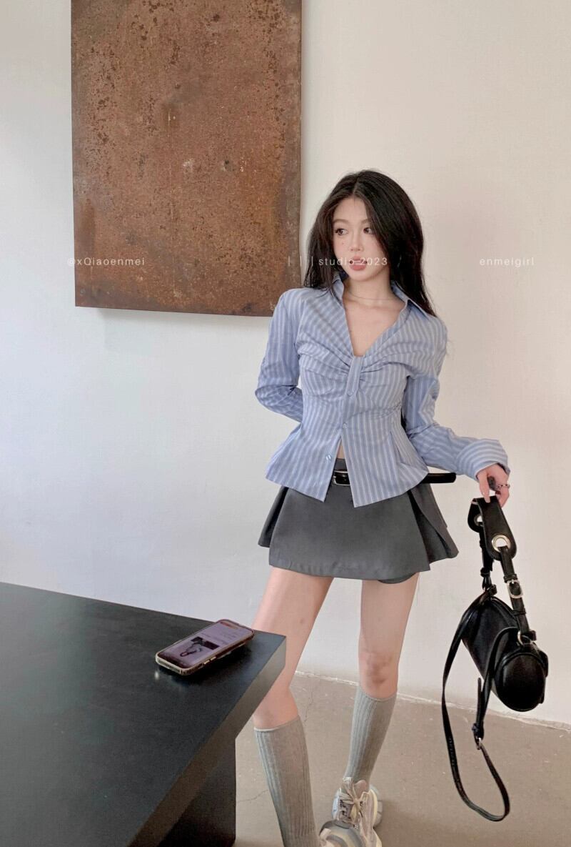 ホットブルーストライプ V ネック長袖シャツ女性の秋の純粋な欲望スリムウエストシャツデザインニッチトップ ロング オータム 秋物 Vネック ピュア bstraw19707485422 | beaute25