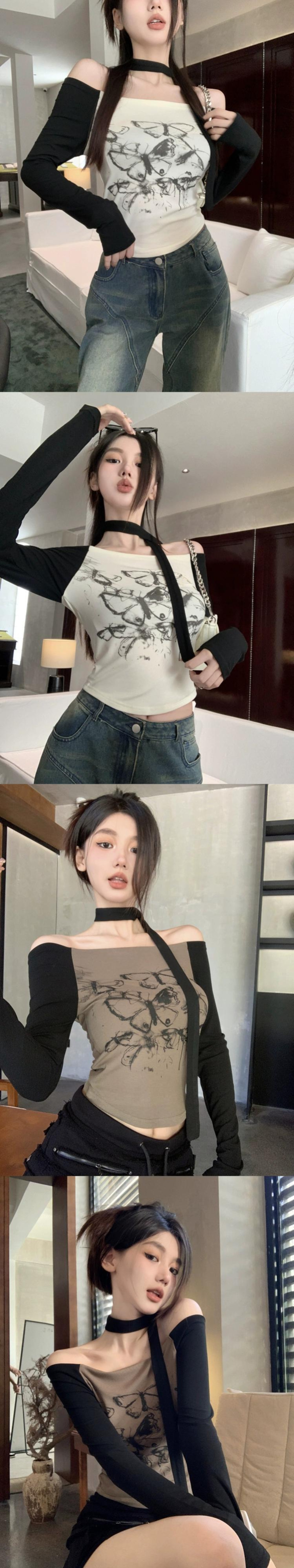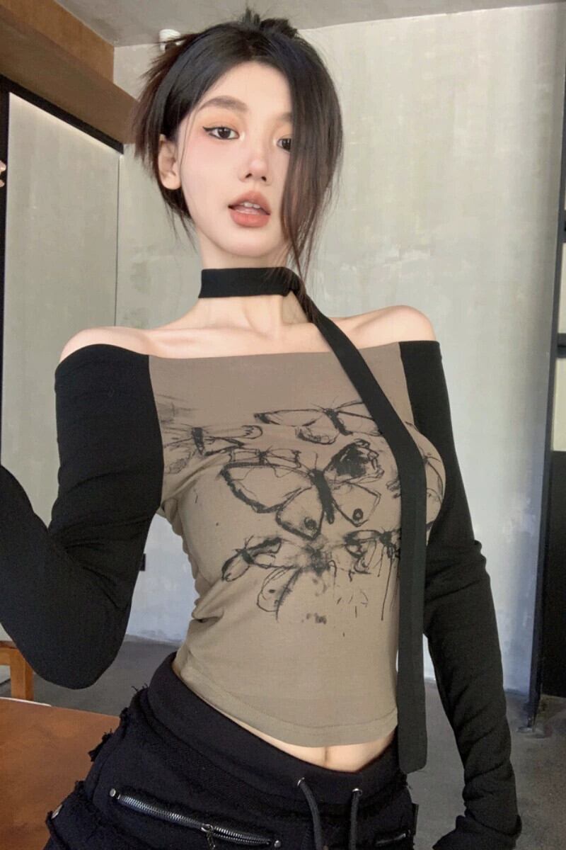 甘いワンショルダー蝶プリント長袖 Tシャツ女性秋スリムフィットボトリングシャツショートオフショルダートップ ロング 大人ガーリー スウィート キュート カジュアル オータム 秋物 bstraw90722240535 | beaute25