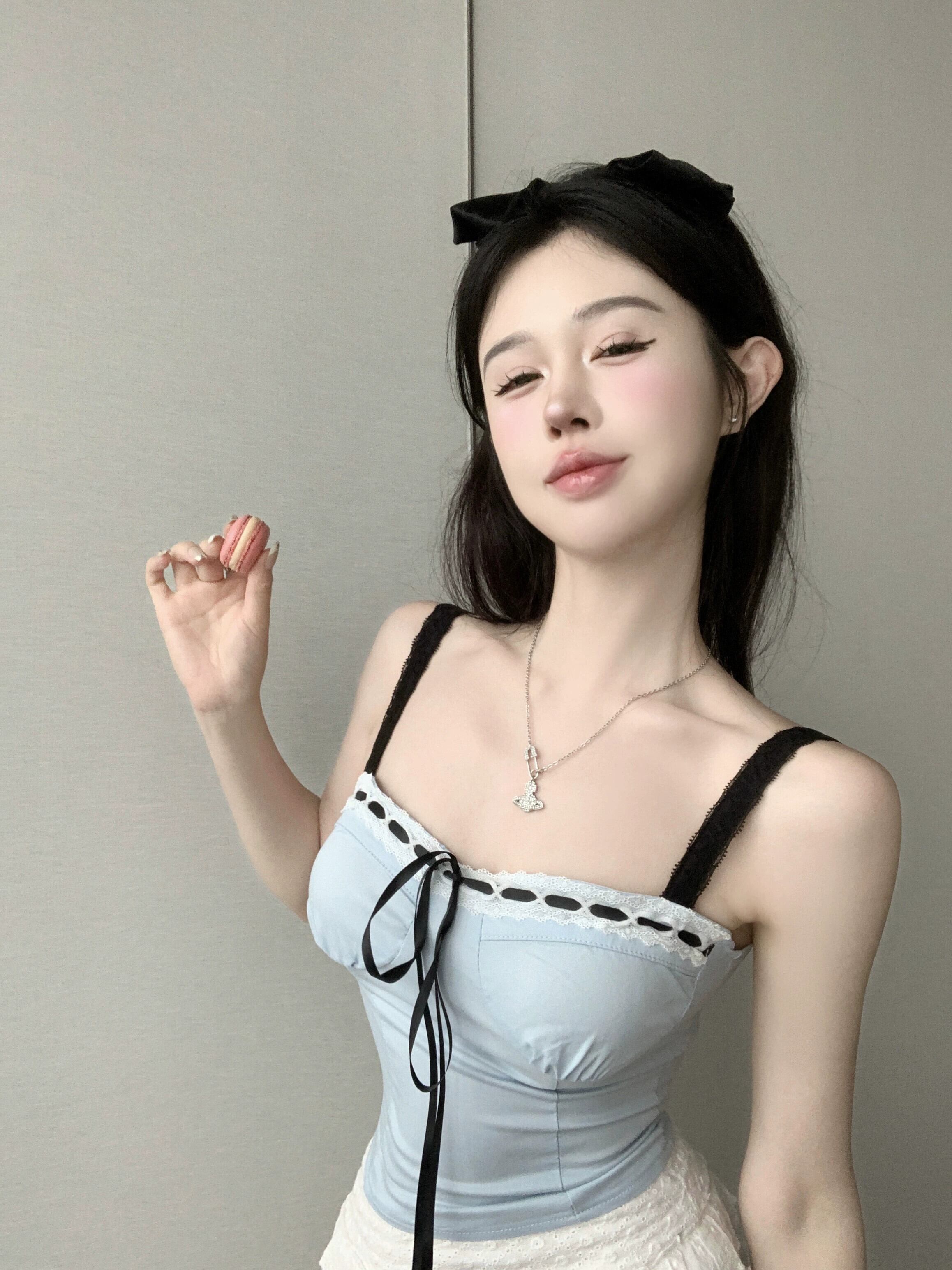 Pure lust セクシーなネクタイ キャミソール女性の夏のレースのインナーと青い蝶ネクタイのショート トップが外で着用 ブルー リボン サマー 夏物 bstraw62276449914 | beaute25