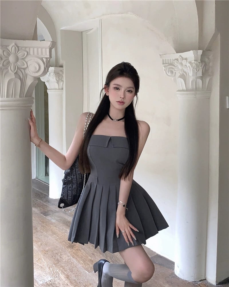 グレーのワンショルダーチューブトップドレス女性の夏のカレッジスタイルの純粋な欲望のスカートセクシーな小さなプリーツスカート サマー 夏物 ピュア bstraw13568335810 | beaute25
