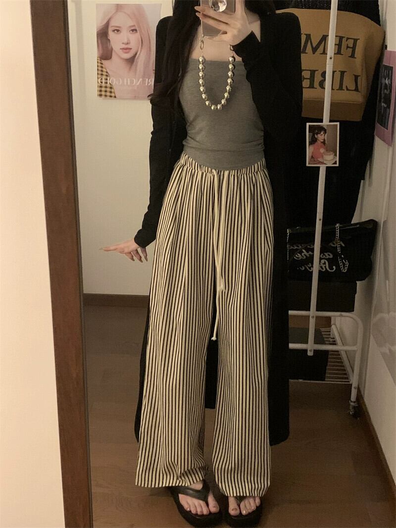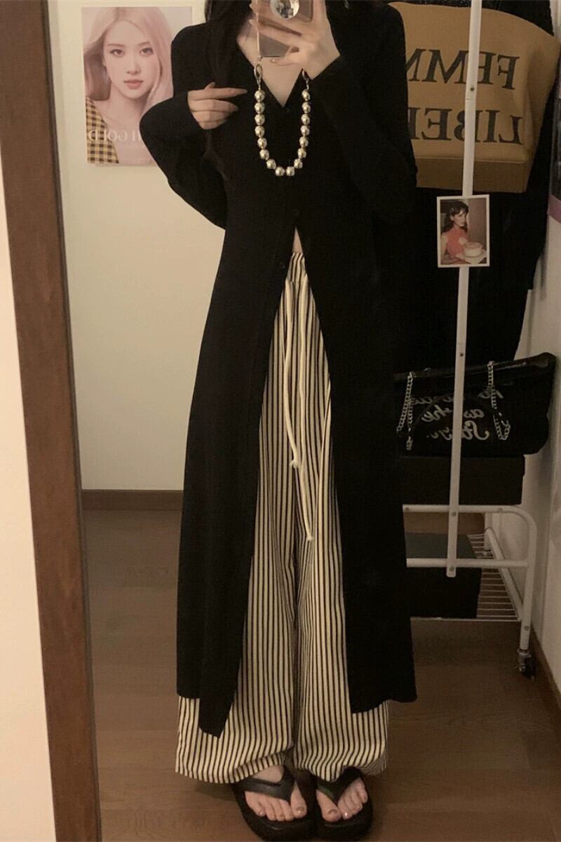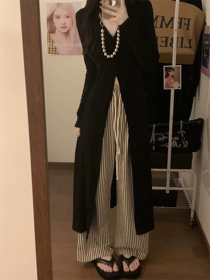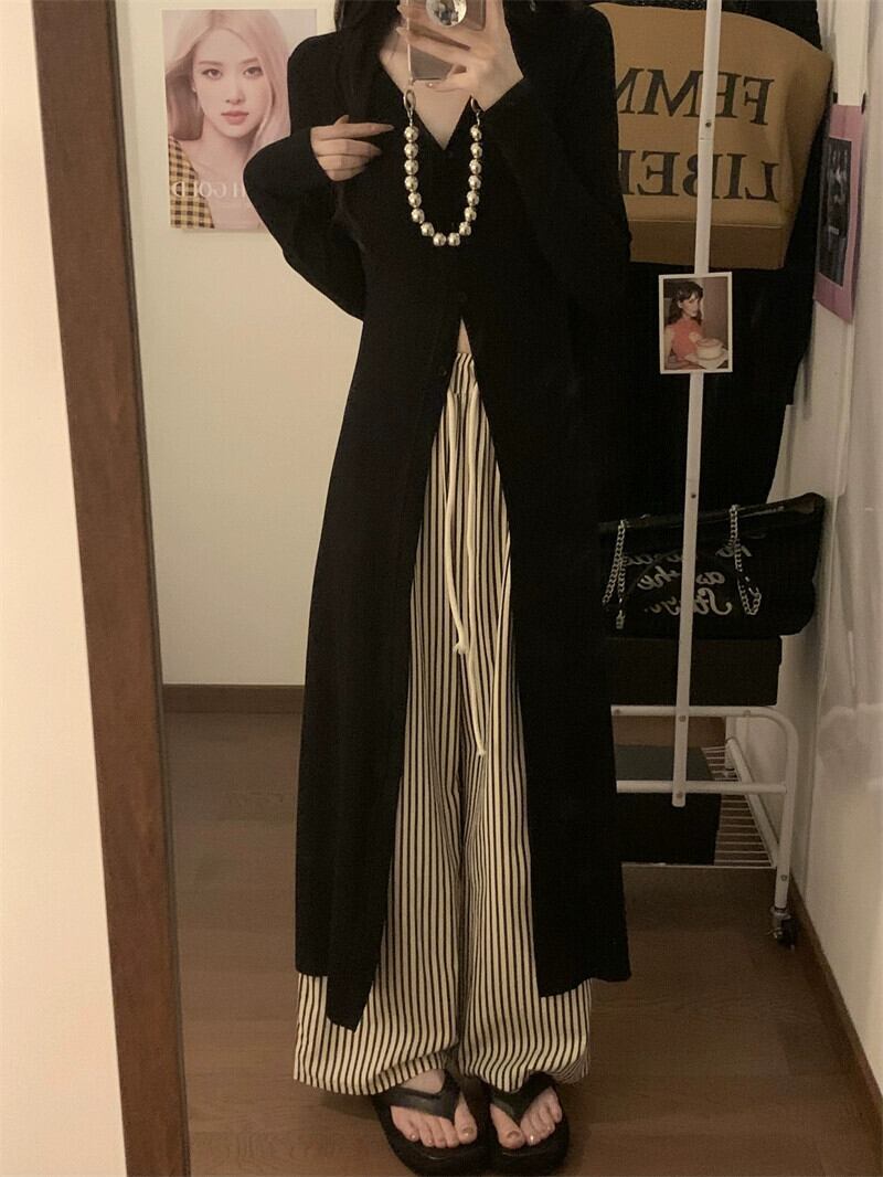 黒長袖 V ネックニットカーディガンジャケットトップレディース秋スーツハイウエストストライプカジュアルパンツ 2 点セット ロング ブラック オータム 秋物 Vネック bstraw1954518780 | beaute25