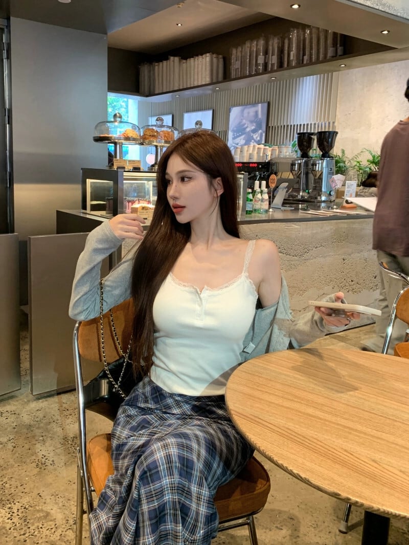 色:白いベスト,グレーのカーディガン,ブルーグリッドスカート